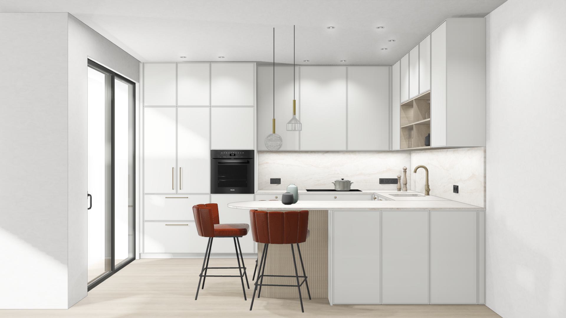 modern minimalist kitchen sleek white cabinets and countertops soft beige marble backsplash subtle brass handles glass pendant lights with brass accents rich red brown leather bar stools elegant light wood flooring large sliding glass doors with black frames bright natural light streaming in airy and sophisticated atmosphere peaceful and inviting