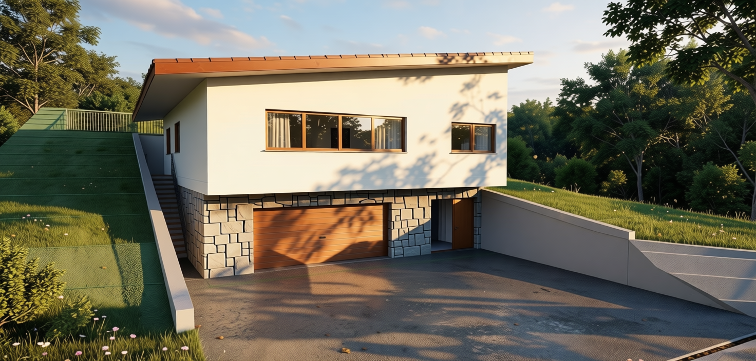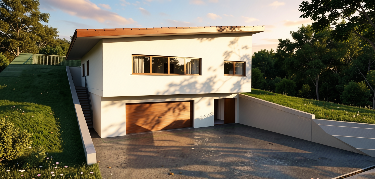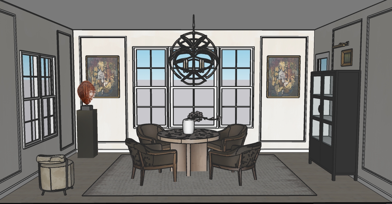 the floors are an oak color the table is light oak wood the chairs are a brown olive fabric with wood legs the walls have an ivory limewash paint on them the outside environment is trees and a yard