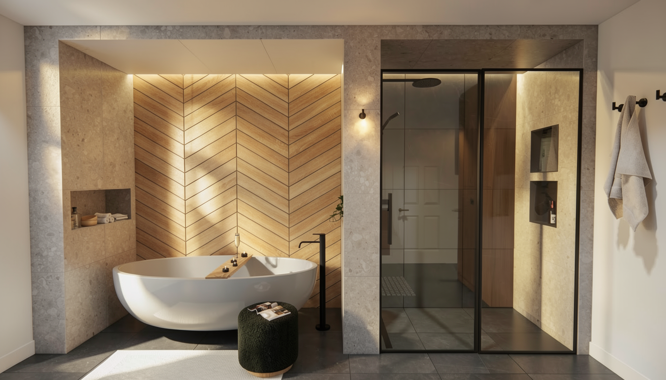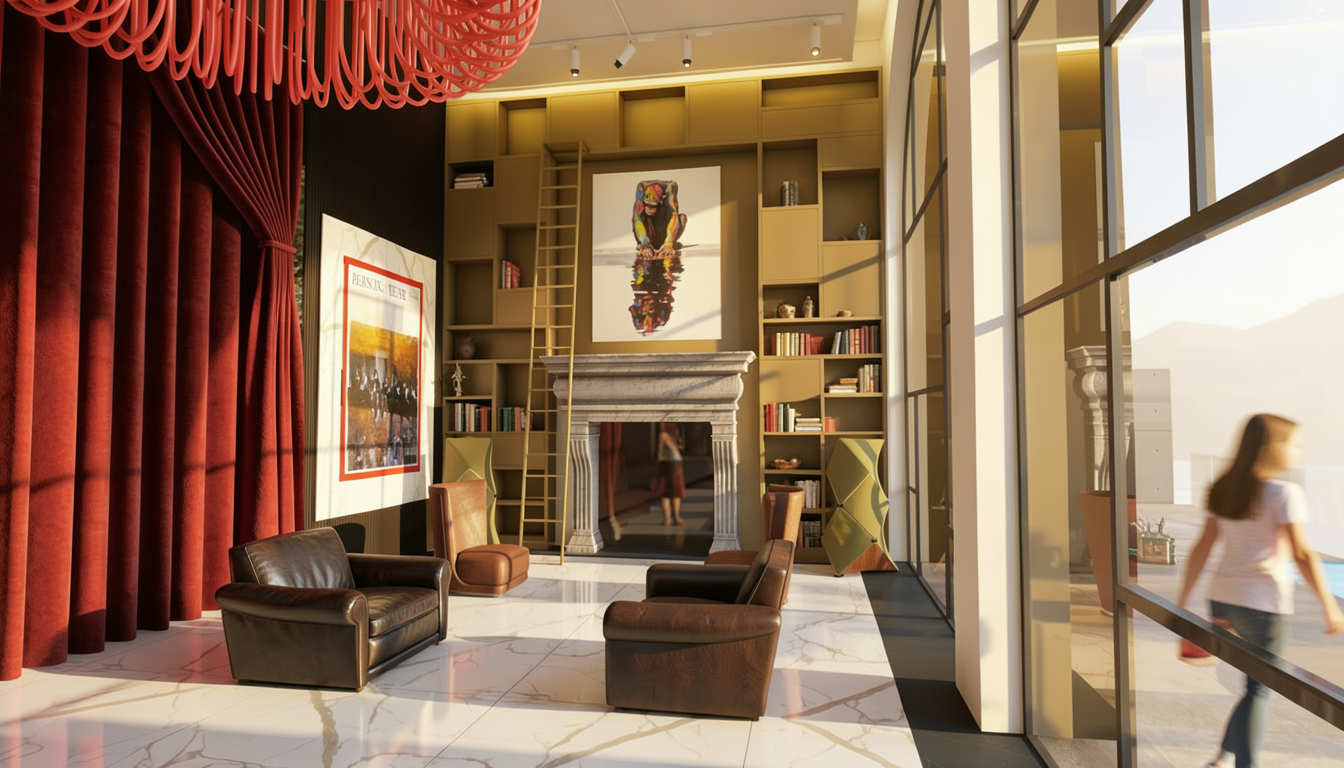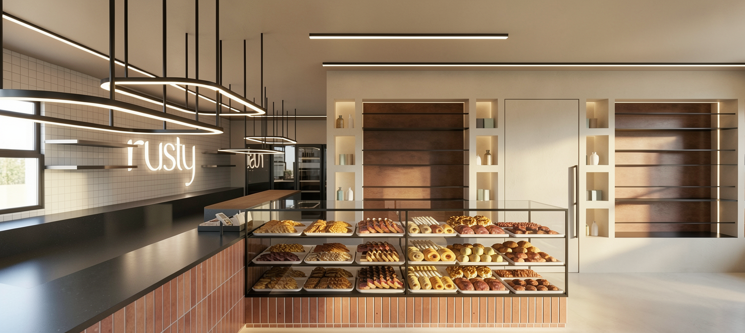 exterior shot make the first image have the same design style and colour palette from the reference image lane grid ceiling a view of a football pitch through the windows potshelf supported with vertical strips a light airy atmosphere with lota of natural light tables set with dining plated and cutlery with a simple contemporary dafodil flower arrangement large scale cream shiny tiles to the flooring