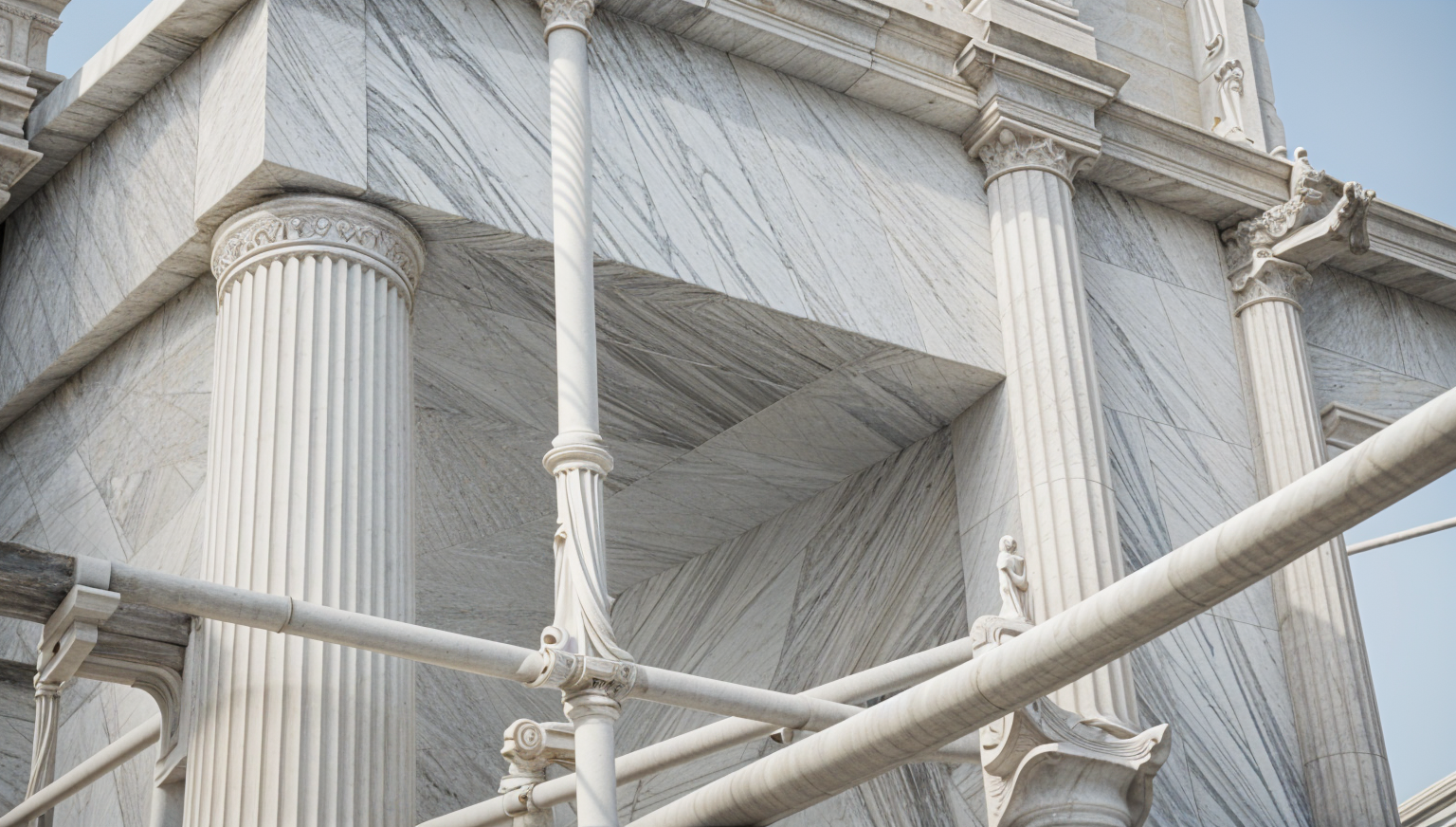 parametricism exterior shot luxury villa sunset vertical structures from 3d printed concrete add some surroundings palm trees only blue rectangle on the right is pool architecture