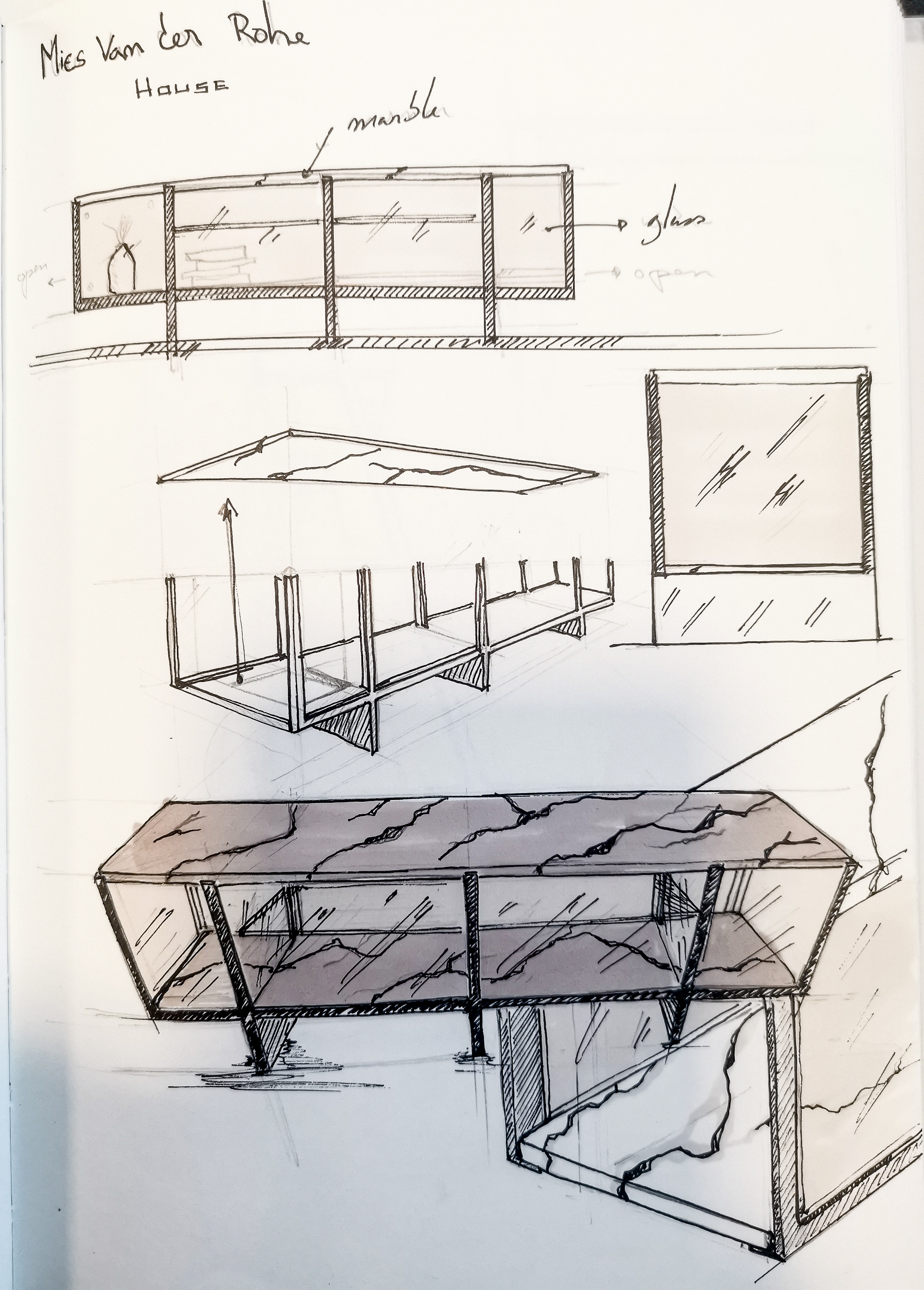 crie uma imagem hiper realista de um aparador inspirado na farnsworth house de mies van der rohe o design deve transmitir minimalismo e eleg ncia moderna caracter sticas principais estrutura principal em metal com acabamento polido linhas retas e propor es equilibradas portas em vidro transparente com leve reflexo permitindo ver o interior tampo superior e prateleira inferior em m rmore branco com veios cinza com textura realista e brilho suave estilo clean com influ ncia do modernismo cores neutras e ilumina o natural suave fundo neutro ou ambiente sofisticado como uma sala moderna com piso claro e paredes brancas perspectiva vista frontal levemente em ngulo mostrando a profundidade e os detalhes dos materiais ilumina o luz natural difusa destacando reflexos no metal e no vidro e textura do m rmore