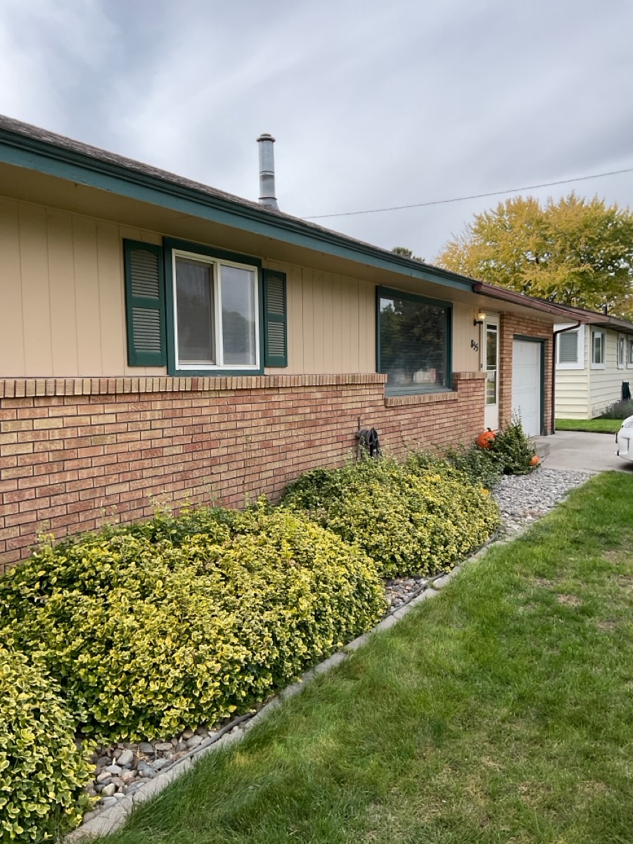 add new white pella vinyl 250 series keep the brick as is and make the siding new horizontal truwood siding in a grey color replace soffit and fascia with grey aluminum