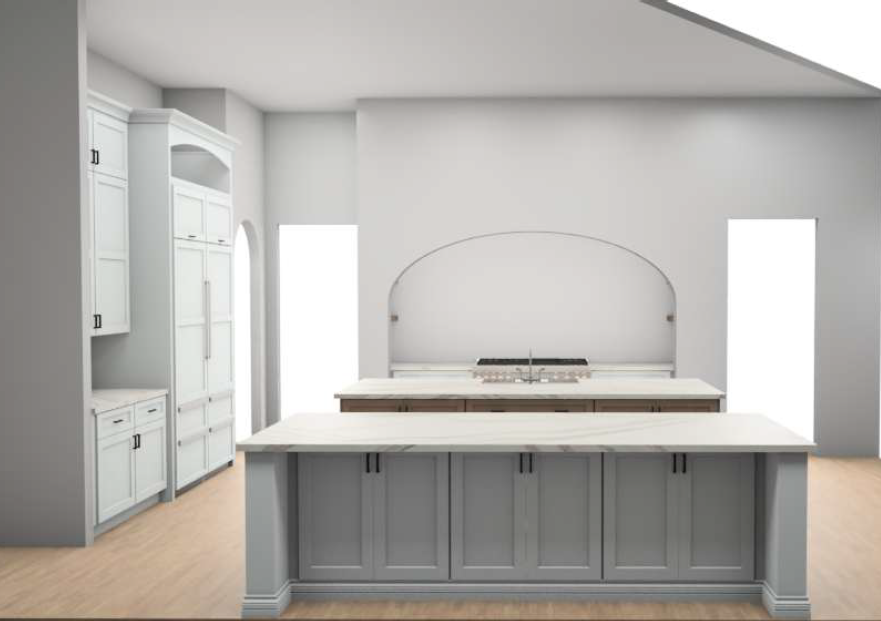 apply stacked stone only to the curved arch surround above the range following the exact existing arch shape the stone must be installed in a true curved radial pattern that precisely follows the arch geometry do not square off the top and do not create any straight horizontal lines across the arch the curve of the arch must remain fully rounded and unchanged wrap the stone around the face of the arch and slightly into the inner return for depth maintaining the original arch proportions hard constraints do not extend stone above the arch do not take stone to the ceiling do not apply stone to the wall or backsplash behind the range do not flatten or straighten the arch shape do not modify the size height or curve of the arch in any way all surrounding wall surfaces must remain smooth painted drywall use a refined warm toned stacked stone soft creams taupes light grays with tight joints and clean alignment that follows the curve ensure the lighter cabinetry reads as true white not gray maintain all cabinetry layout countertops and materials exactly as shown only modify the arch surround enhance lighting and material clarity for a high end realistic finish
