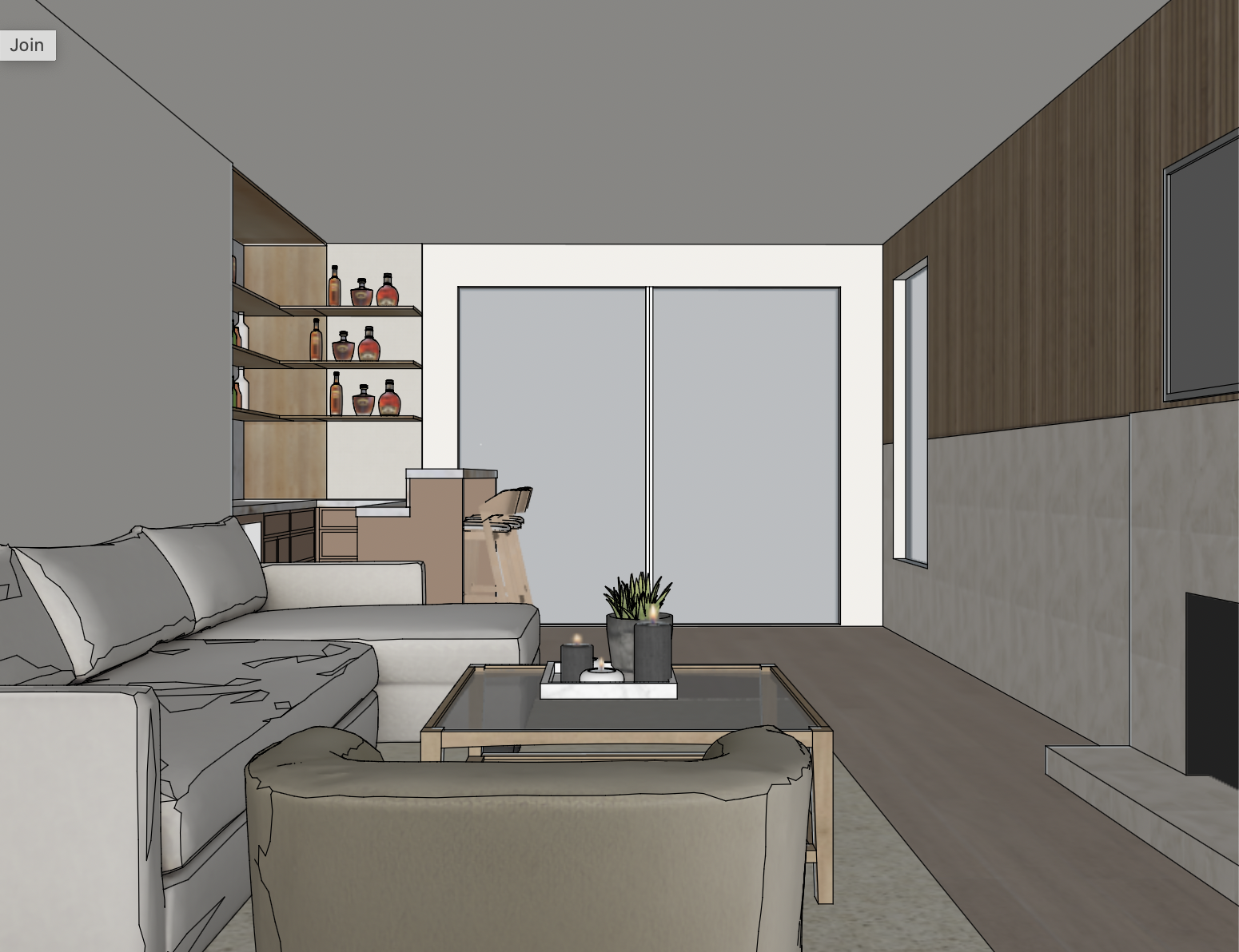 interior shot create an editorial style photorealistic render without removing or adding anything scale and placement of all items needs to stay the same do not change colors textures or materials the area at the back of the room is a sliding glass door which needs greenery visible outside