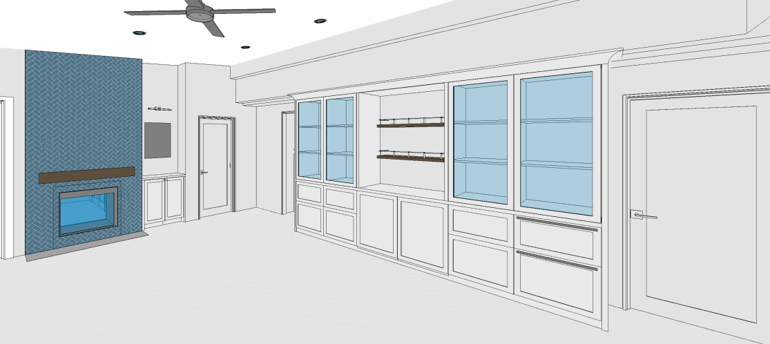create a modern living room interior with a cozy and elegant atmosphere the color palette includes calming blues soft grays and warm browns the wall with the fireplace features a striking blue herringbone tile pattern the fireplace is sleek and modern with a central opening the cabinetry is a crisp matte white with wood shelving accents the ceiling fan is a white finish the doors are a muted white with contemporary handles recessed lighting casts a soft inviting glow over the room enhancing the serene and stylish ambiance white oak wood floor