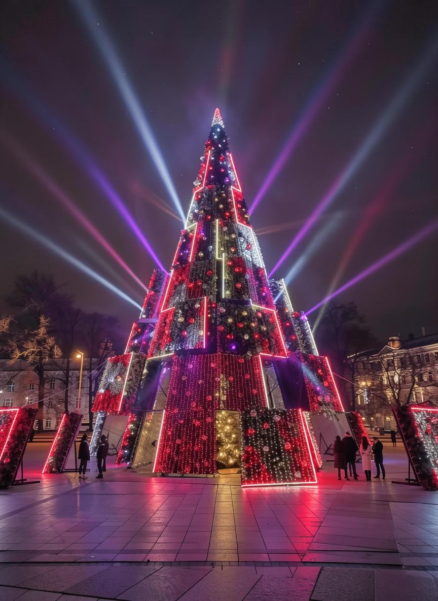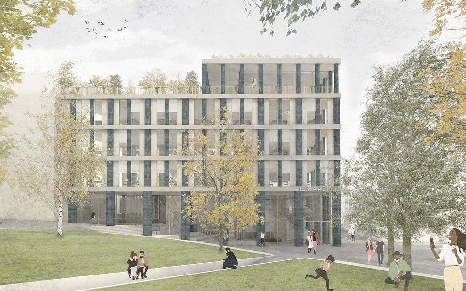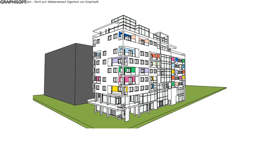 exterior shot render in the same post digital style as the reference but respect the colors and structure of the original input modern social housing building with white facade plaster and colorful balconies with glass railings grey building in the back blurry conceptual cafe furniture on the left side of the building with people sitting glass cylinder with spiral staircase leading up to the big terrace glass facade on the roof and in the middle of the building street on the right of the building and another building in the back blurry conceptual trees around the building