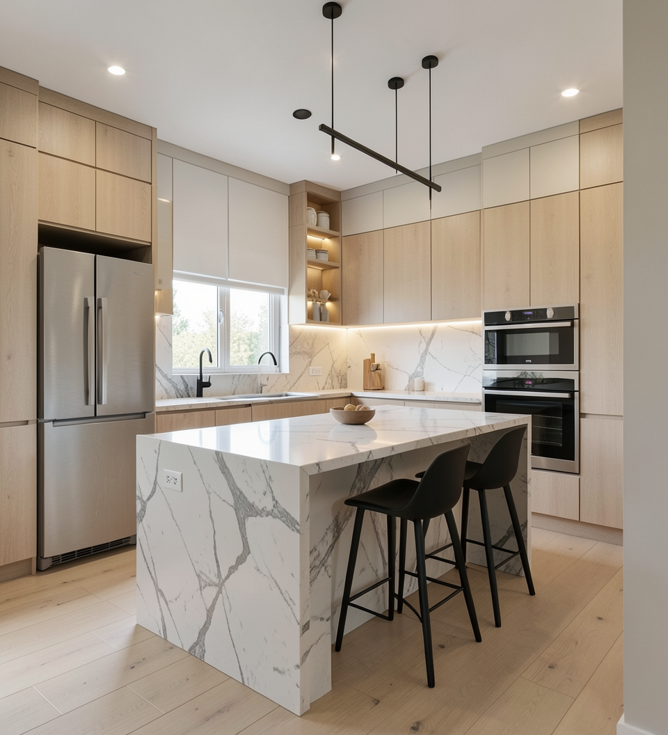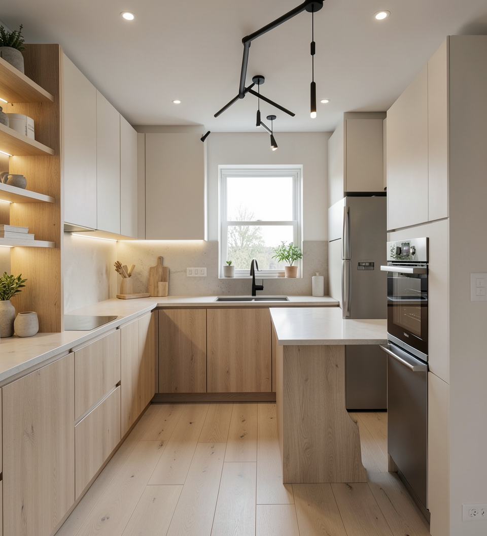 convert this floor plan into a realistic isometric 3d view of a kitchen show the space from an elevated angle with furniture walls and details visible modern scandinavian inspired kitchen interior with warm natural materials and a clean minimalist aesthetic light oak flat panel cabinetry with integrated handles full height cabinets and matte off white upper cabinets custom french door refrigerator matching the cabinet colors and built in cooktop with a simple slab backsplash under cabinet led strip lighting illuminating the countertop light wide plank oak flooring throughout cabinets above with built in warm lighting displaying minimal decor pieces soft recessed ceiling lights and modern black accent ceiling fixtures neutral color palette of light wood white beige and soft greys large window above the sink bringing in natural daylight sleek matte black faucet and modern sink integrated into the island photorealistic architectural render ultra realistic materials soft ambient lighting high end residential design wide angle interior shot 4k quality use the same furniture as shows on the plan do not change the orientation of the floorplan