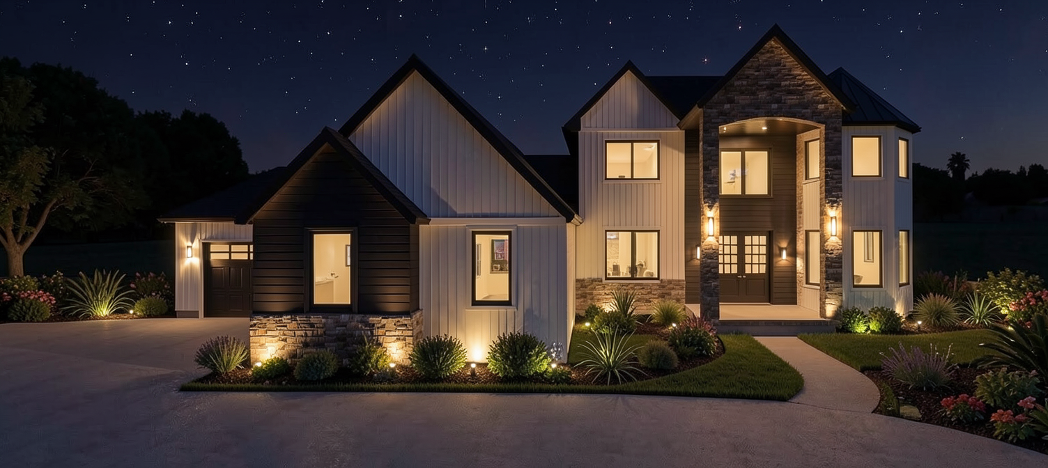 suggest a rolling hills in the far distance and trees view on the left hand side behind the house