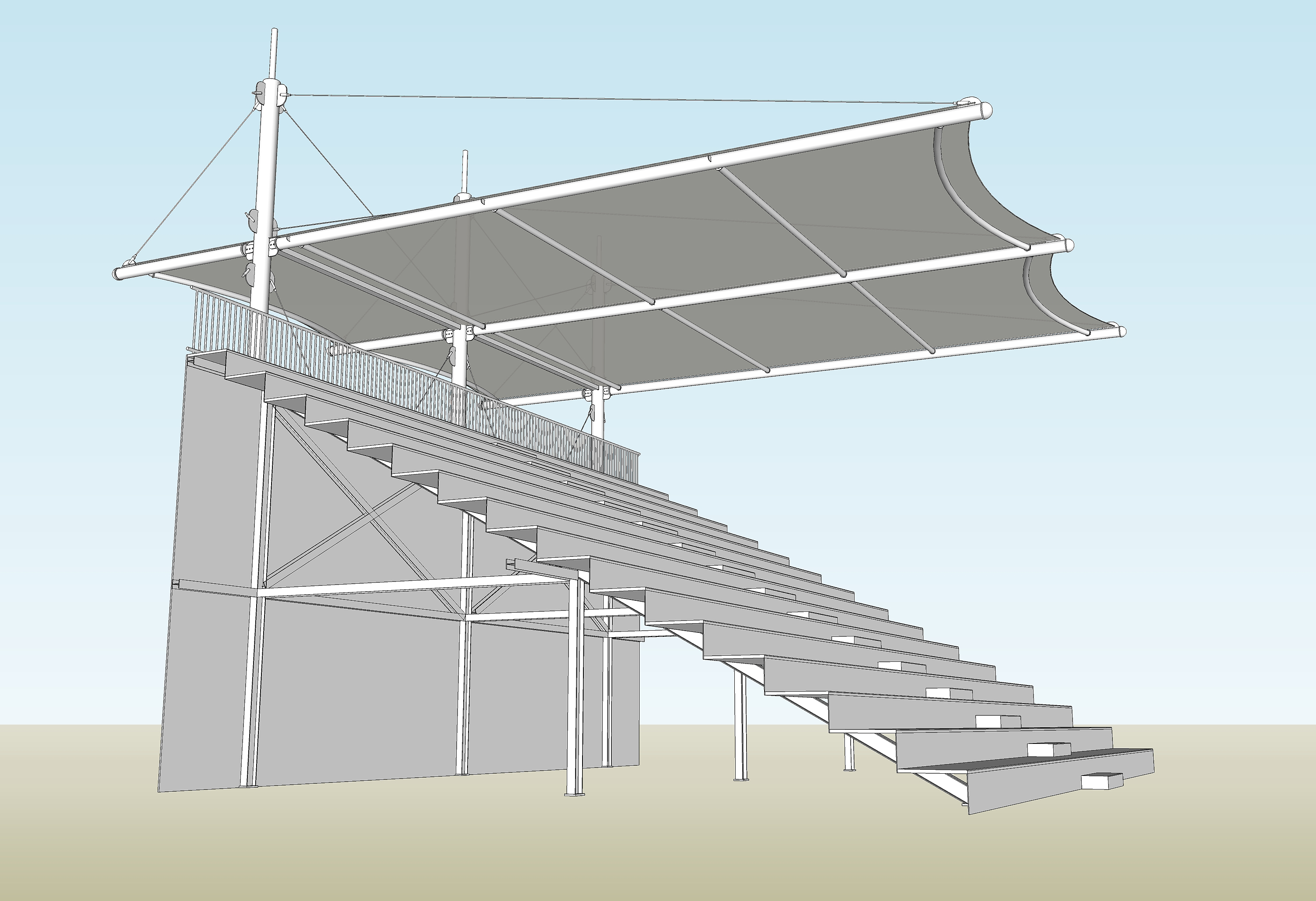 exterior shot render a modern architectural structure of bleachers with a fabric canopy use a soft pastel blue sky for the background and a light beige ground for the base the bleachers should be a sleek metallic gray with reflective surfaces the fabric canopy above should be a crisp white with subtle shadows creating a lightweight feel ensure the atmosphere is bright and inviting highlighting the clean lines and modern design elements architecture