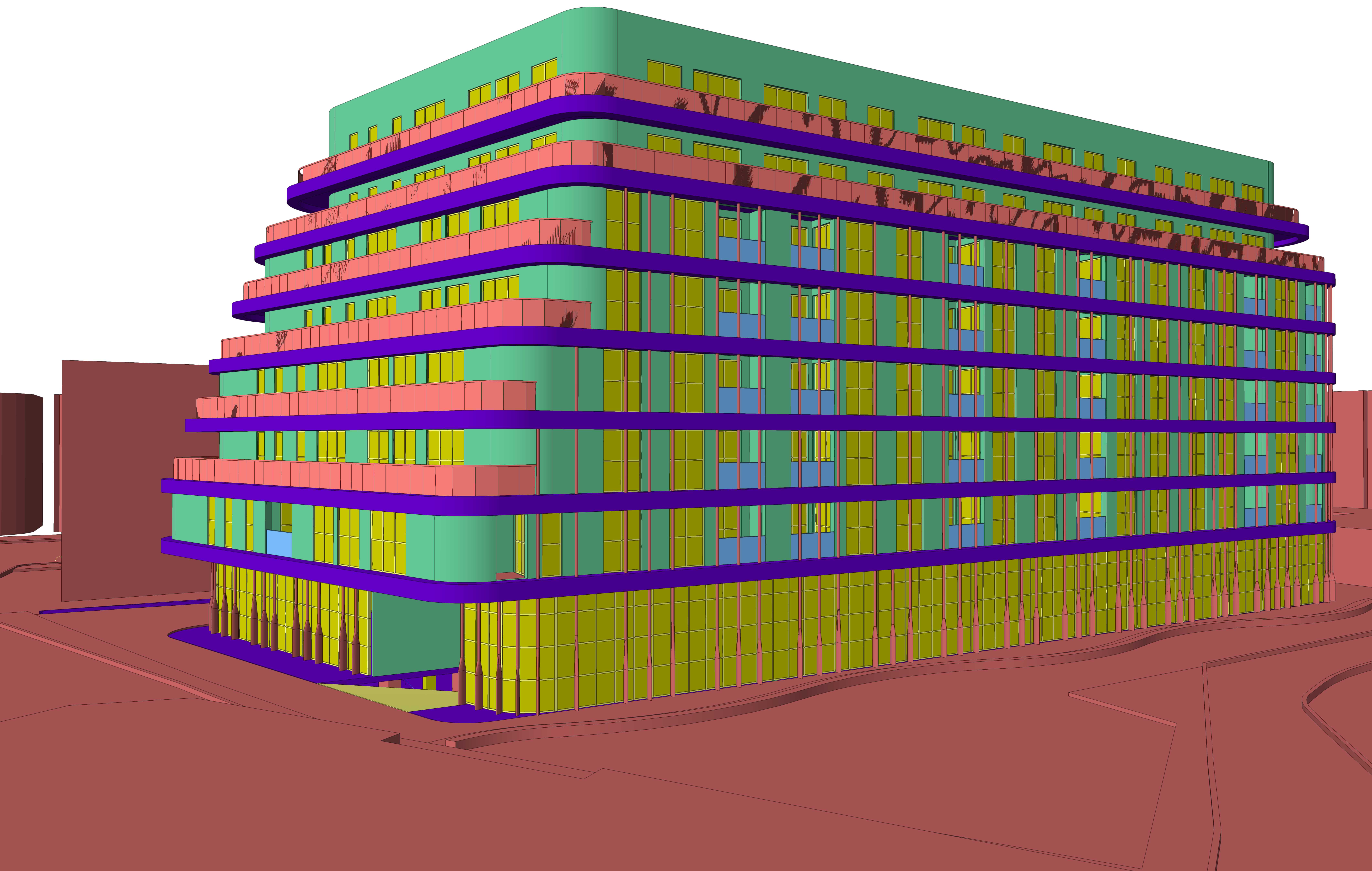 building with a ramp going down to the garage on the left corner near the port in a coastal city