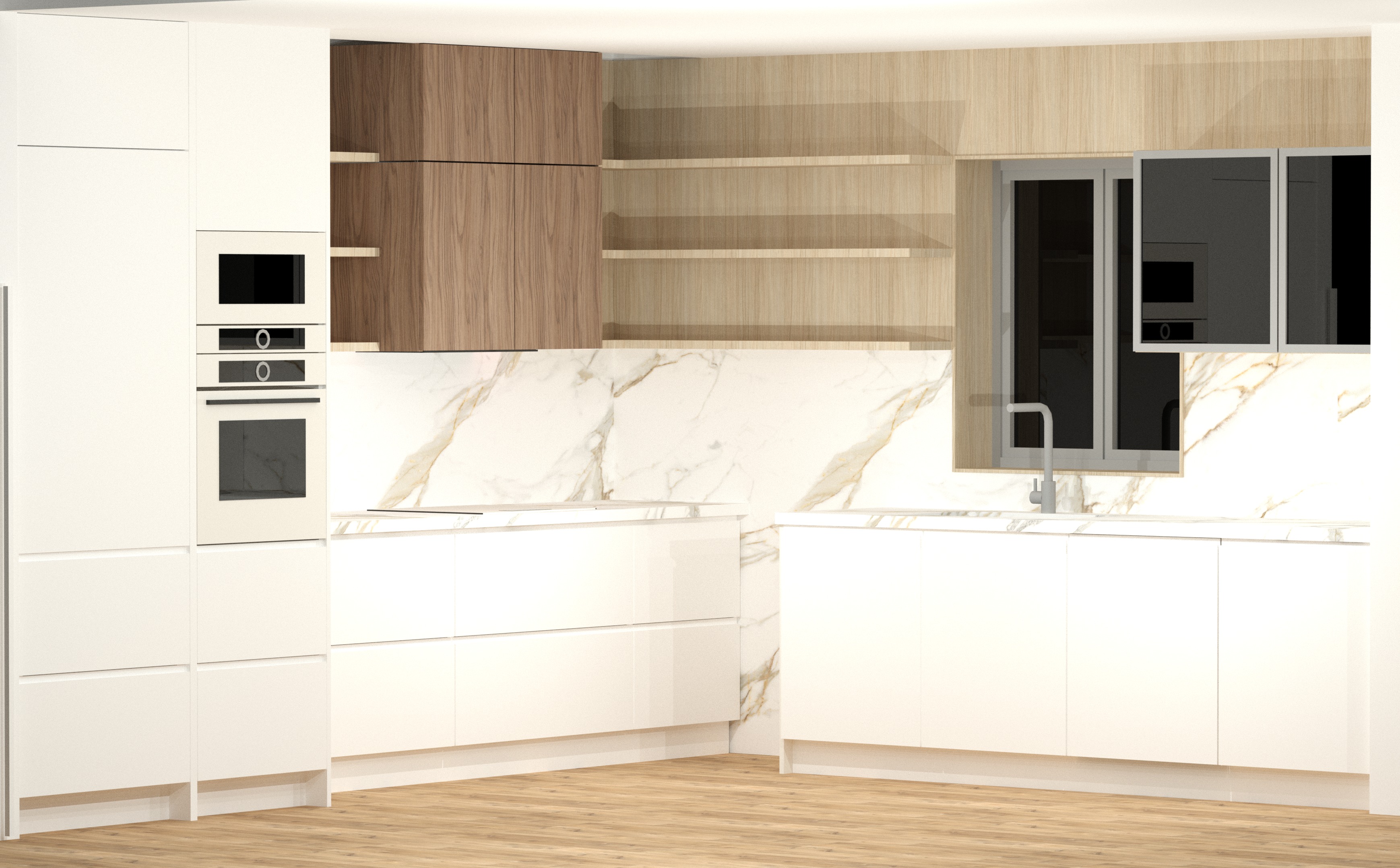 mantener geometria y colores al 100 distinguir 3 colores de madera el pavimento tono 1 de madera los estantes tono 2 de madera y el mueble de campana tono 3 de madera mas oscuro a adir luz en los estantes a adir decoracion de cocina en los estantes dar realismo a la imagen y mantener formas tonos y colores