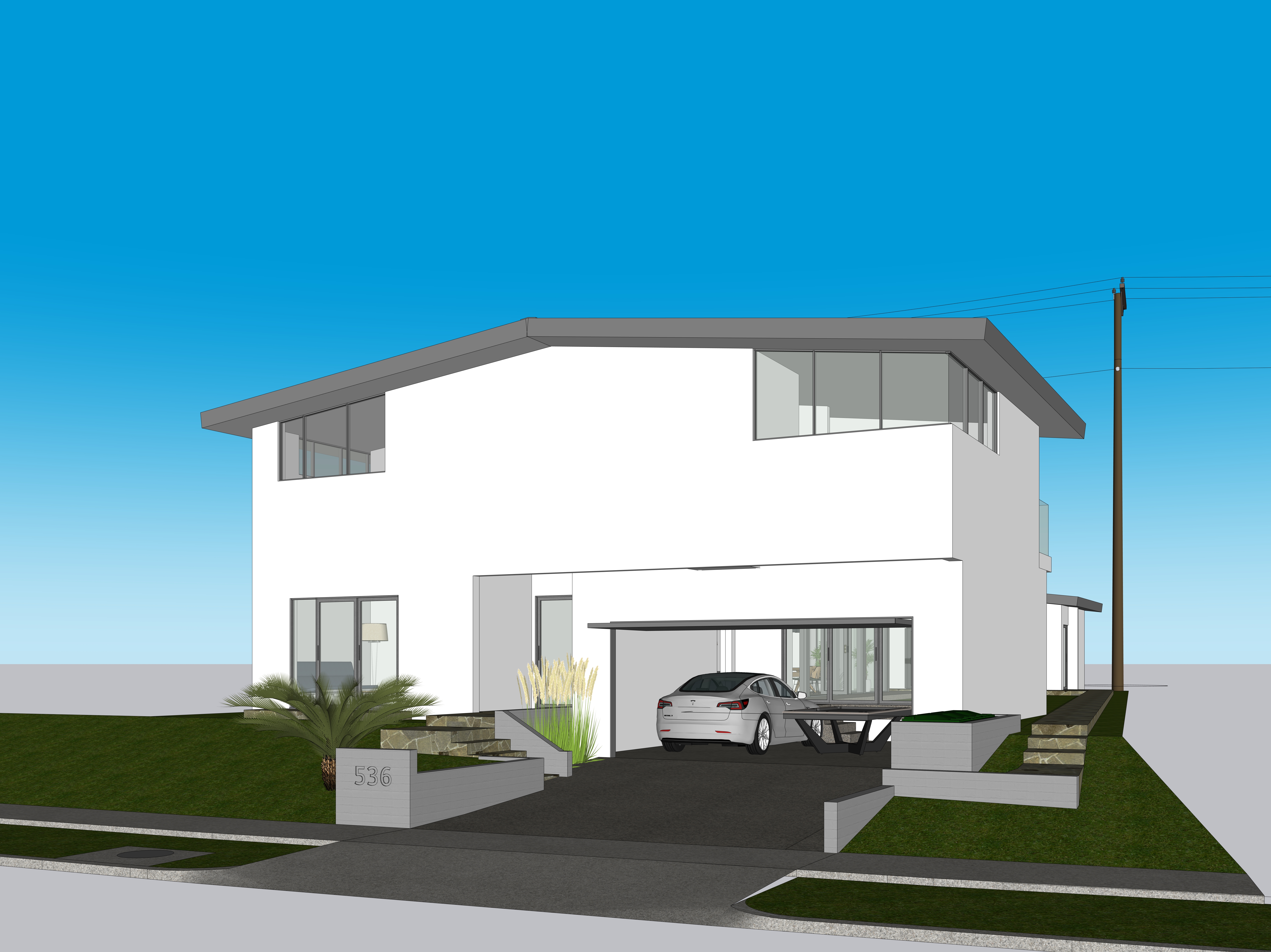 evening view lights on inside the house add california wild grasses and flowers to the landscape add grass in the the yard space enhance the glazing materials add some palms and trees adjacent to the house on the left and right sides of the view add some lights in the planting areas use the perspective view from the source image