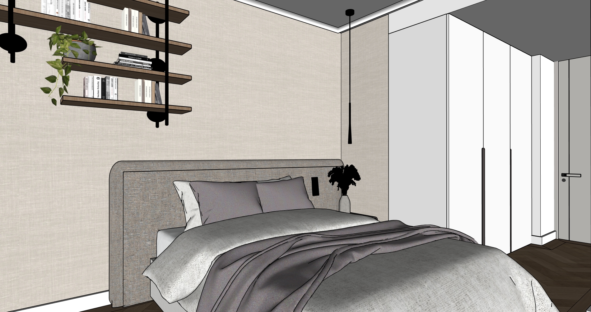 necesito una imagen fotorrealista de este dormitorio mejora texturas y a ade luz natural suave entrando por las ventanas ajusta el balance de colores ahora una vista de noche con la luz perimetral de techo encendida no pongas luz en la trasera el cabecero solo la perimetral de techo la colgante que va encima de la mesita y el foco del pasillo