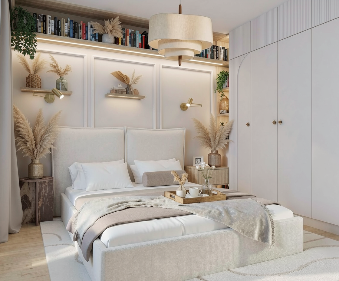 add decoration little pampas grass add a coffee tray on the bed light like in the evening