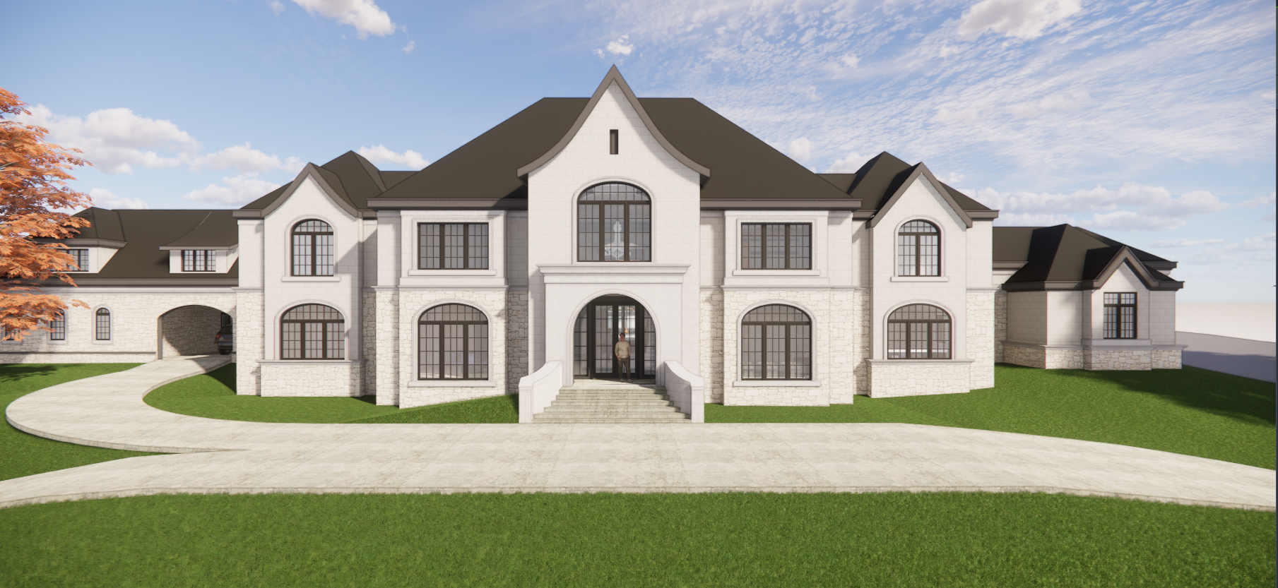 dark charcoal metal roof with dark fascia light limestone veneer plaster trim reflective windows lush green bushes and trees with flower beds in front of house cobblestone driveway background trees native to tennessee