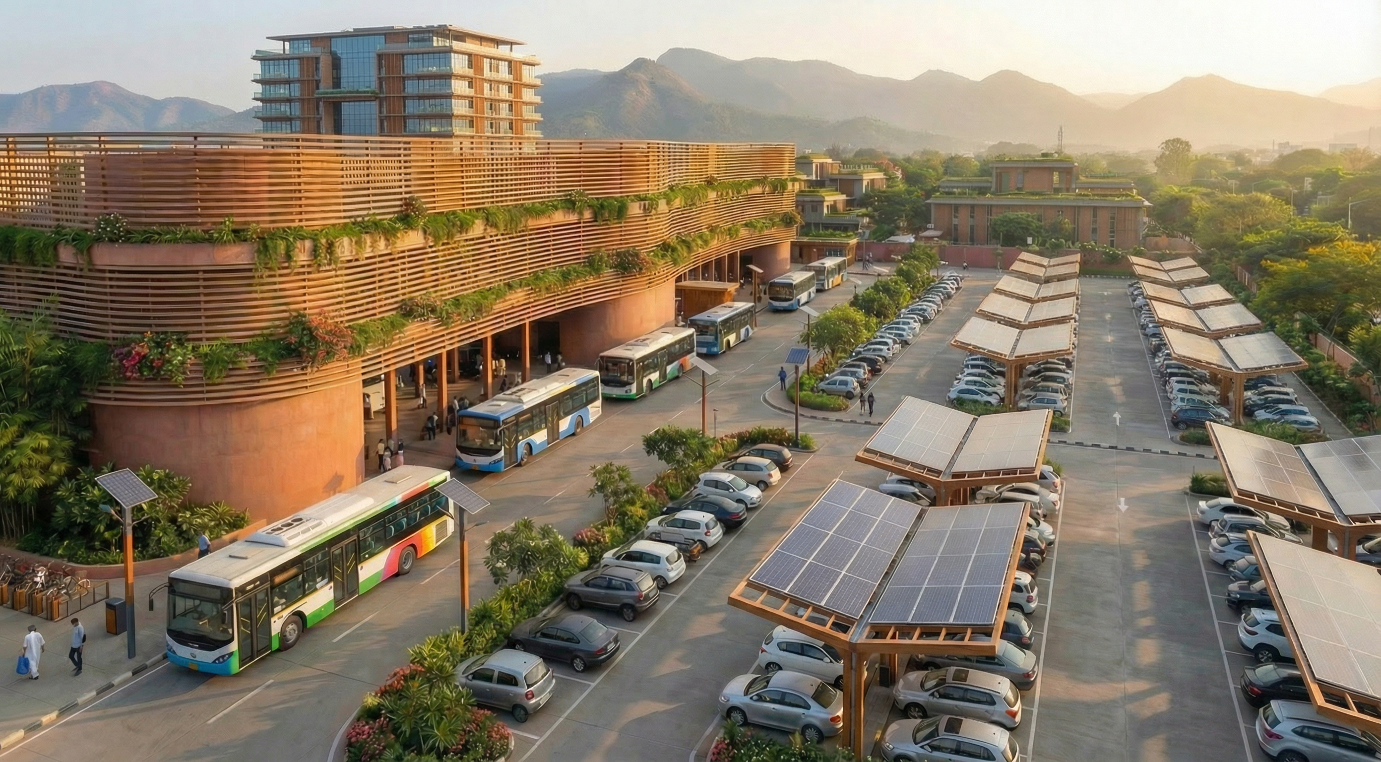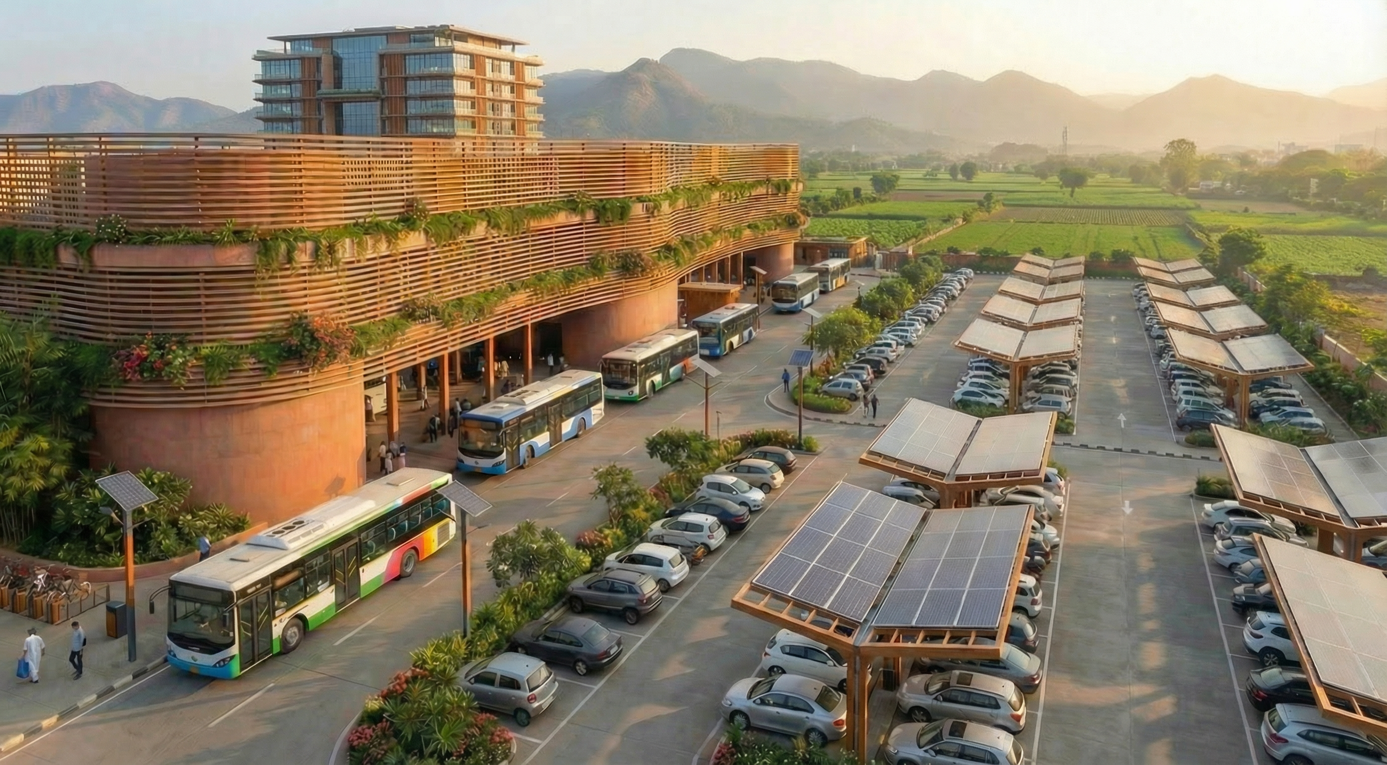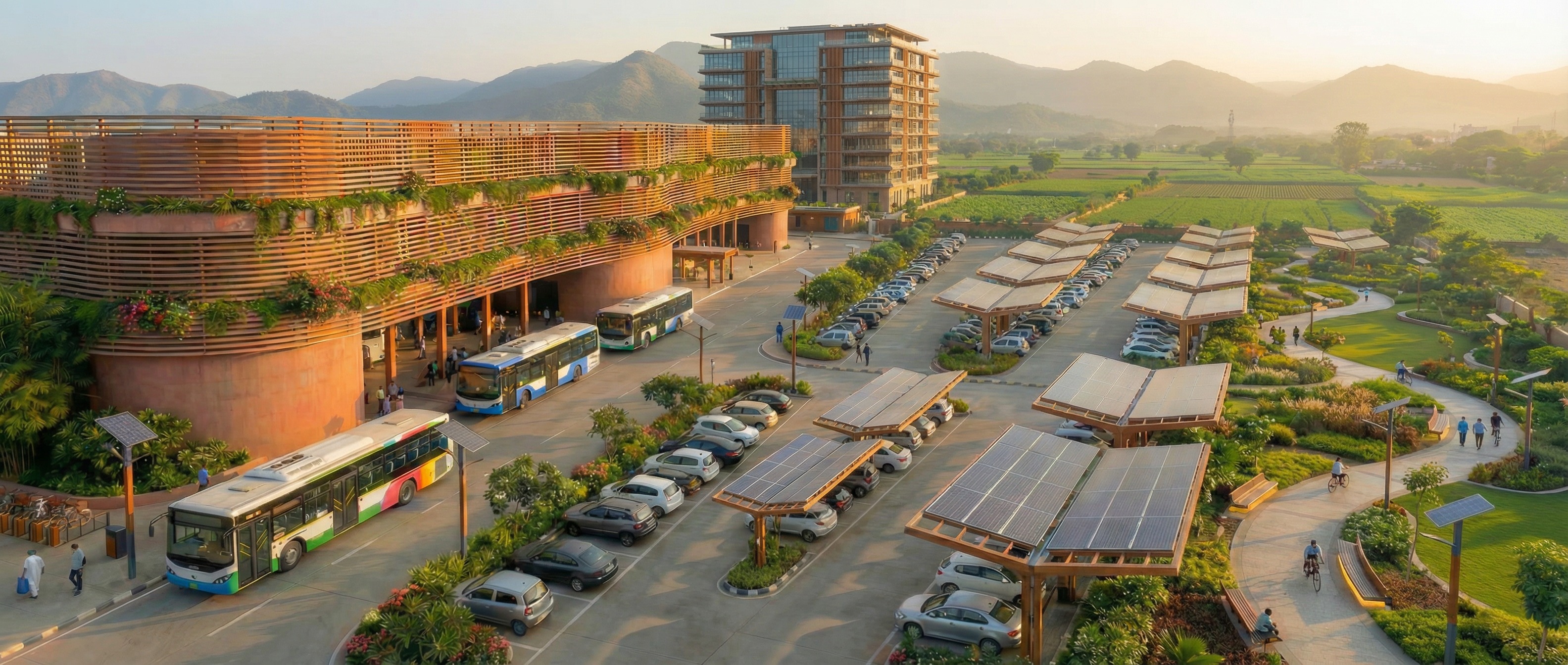 photorealistic architectural render based strictly on the provided image relocate the 10 story building placing it directly in the farmland at the background keep the farmland visible in the far background beyond the park and buildings to preserve the rural setting and depth preserve the original lighting camera angle scale and architectural language do not introduce additional buildings urban density or new typologies