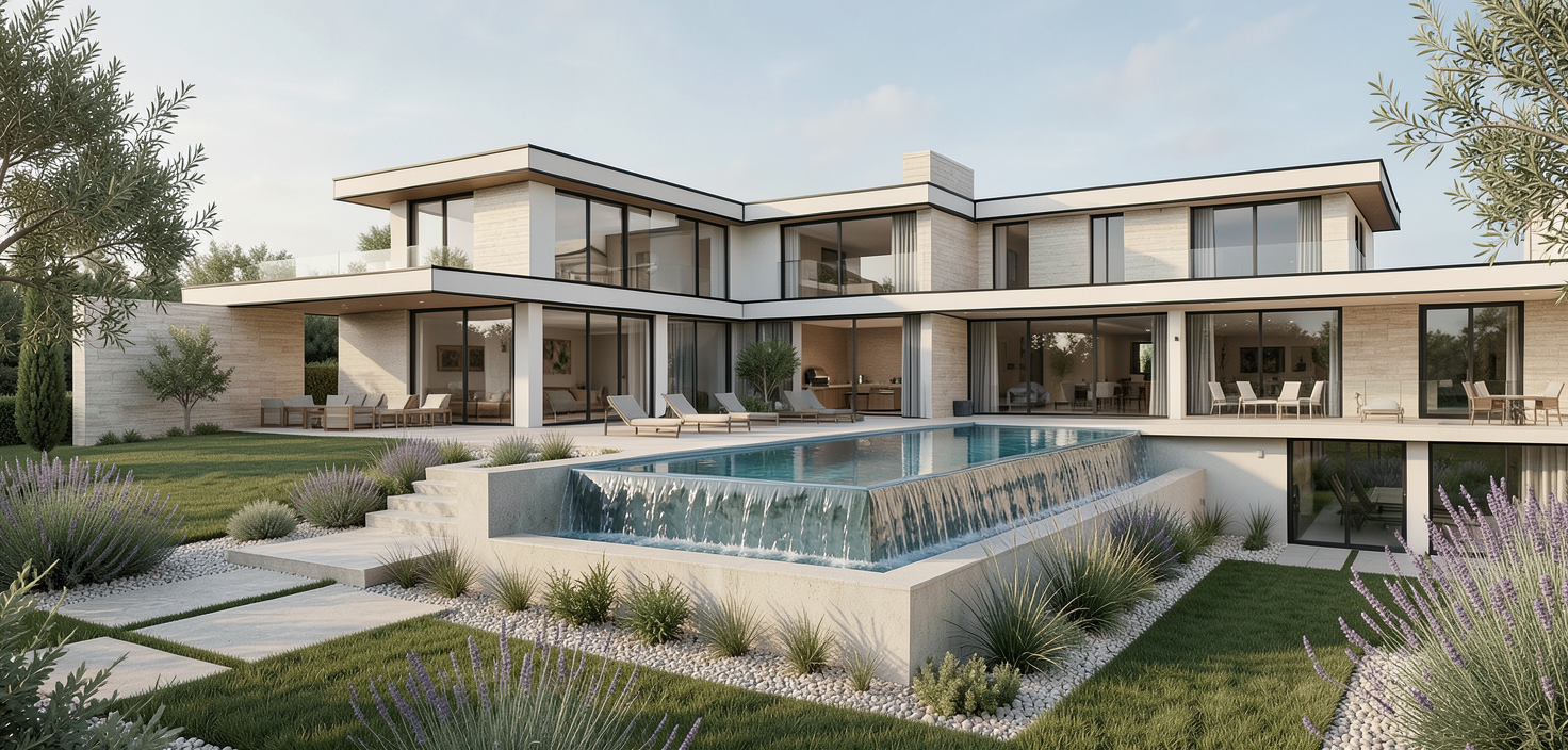 render using the exact original geometry with zero changes to massing proportions roof shapes floor heights openings terraces or building volumes do not alter or reinterpret any architectural form edge detail add a black thin shadow line or metal trim only on the top visible edges of the two main slabs do not wrap it underneath or around the slab only as a top edge finish detail this is a material finish treatment not a geometry change openings and use clarification on pool fa ade from right to left 1st bayfrom the right open outdoor passage no doors no glazing 2nd bay from the right recessed niche used as an outdoor bbq area not an interior room render as a shaded recessed outdoor space with built in bbq counter storage and outdoor kitchen elements remaining bays treat according to existing model openings only add glazing only where the model already has enclosed spaces pool instruction keep the existing pool shape and position exactly as modeled but render it as an infinity edge pool where water overflows cleanly on one side and cascades visually to the second lower level below no change to pool footprint or walls only water behavior and edge treatment architecture style contemporary luxury villa flat roofs strong horizontal lines layered volumes light beige off white stone or stucco fa ade with subtle horizontal texture black or dark bronze aluminum window frames only where glazing truly exists deep roof overhangs with sharp clean edges landscape mediterranean style landscaping olive trees cypress trees lavender rosemary thyme ornamental grasses gravel and stone ground covers terracotta and limestone tones drought tolerant species clean but natural layout no tropical plants pool materials light stone or concrete coping calm blue green water realistic reflections visible infinity overflow to lower level lighting soft natural daylight warm climate feel clear or lightly hazy sky realistic sun angle rendering style ultra photorealistic high end architectural photography look global illumination accurate shadows realistic reflections high material detail no stylization camera eye level or slightly elevated wide angle without distortion courtyard and pool in foreground villa as main focus negative prompt no geometry changes no added or removed building volumes no fake doors or windows no closing outdoor areas no changed proportions no tropical landscaping no fantasy style no cartoon no exaggeration no distortion no low detail no sketch