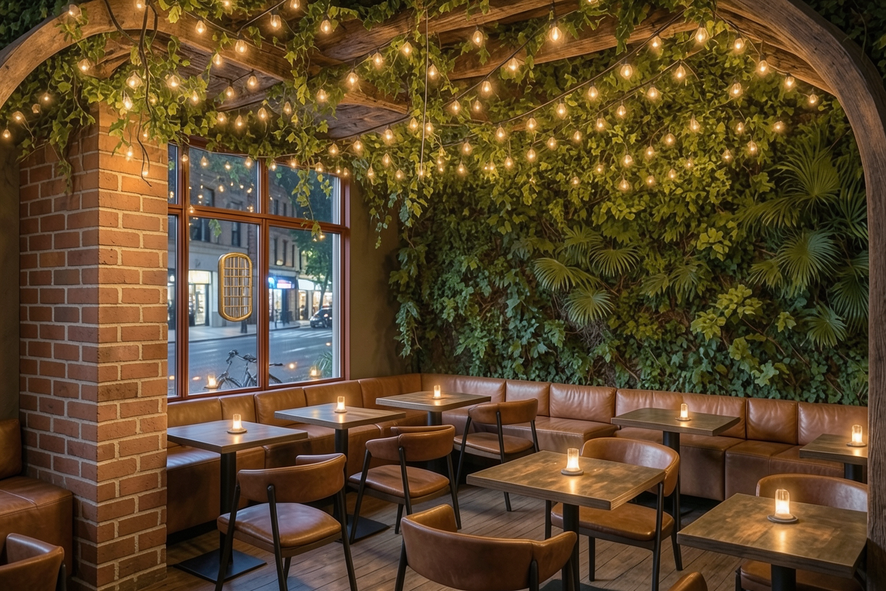 buildings set in naturally sloped hill covered bridge with large windows and water feature under old stone farmhouse with windows vertical shiplap mill house with large windows tall grass hill foreground fog trees in background