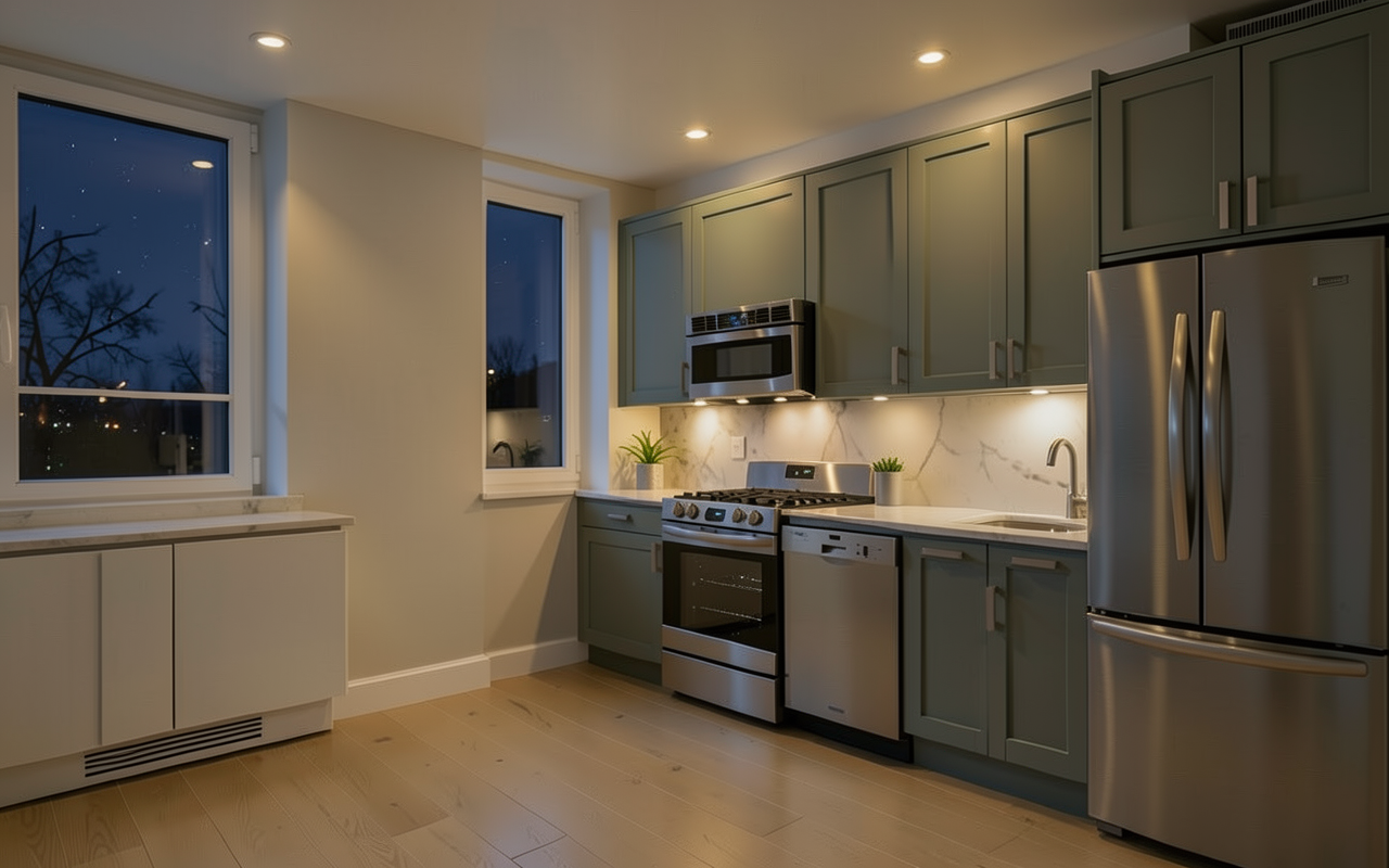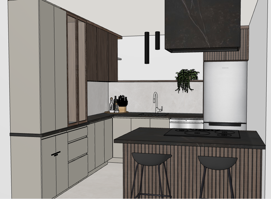 lumimous kitchen with mat black dekton counters and hood make the baige cabinets lighter