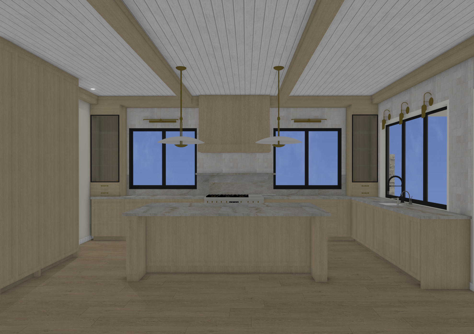 light oak cabinetry ambient dim lighting white plank ceiling