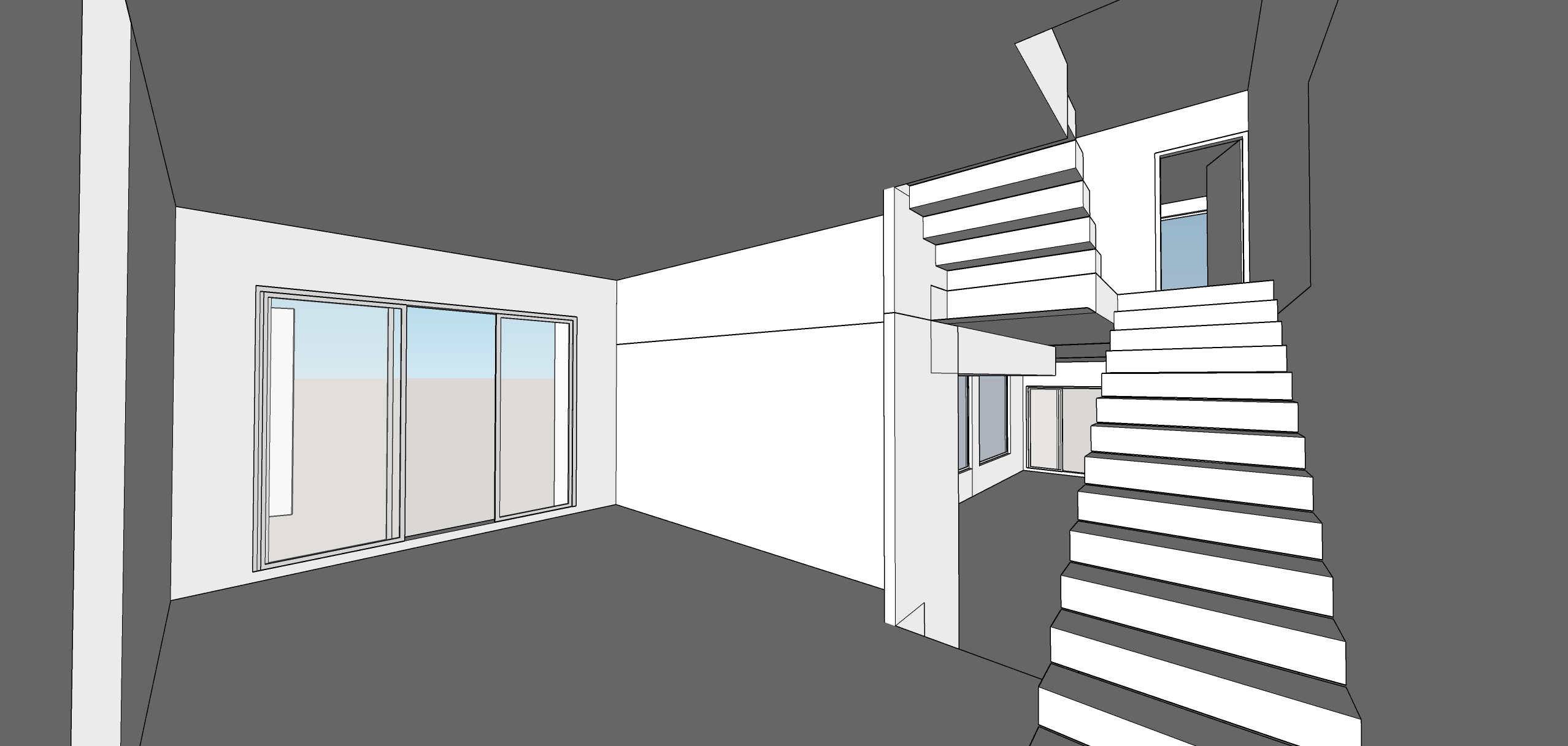 luxury interior viewing underneath a curve feature staircase at the right looking into a kitchen with a seating space and a tv console in the left