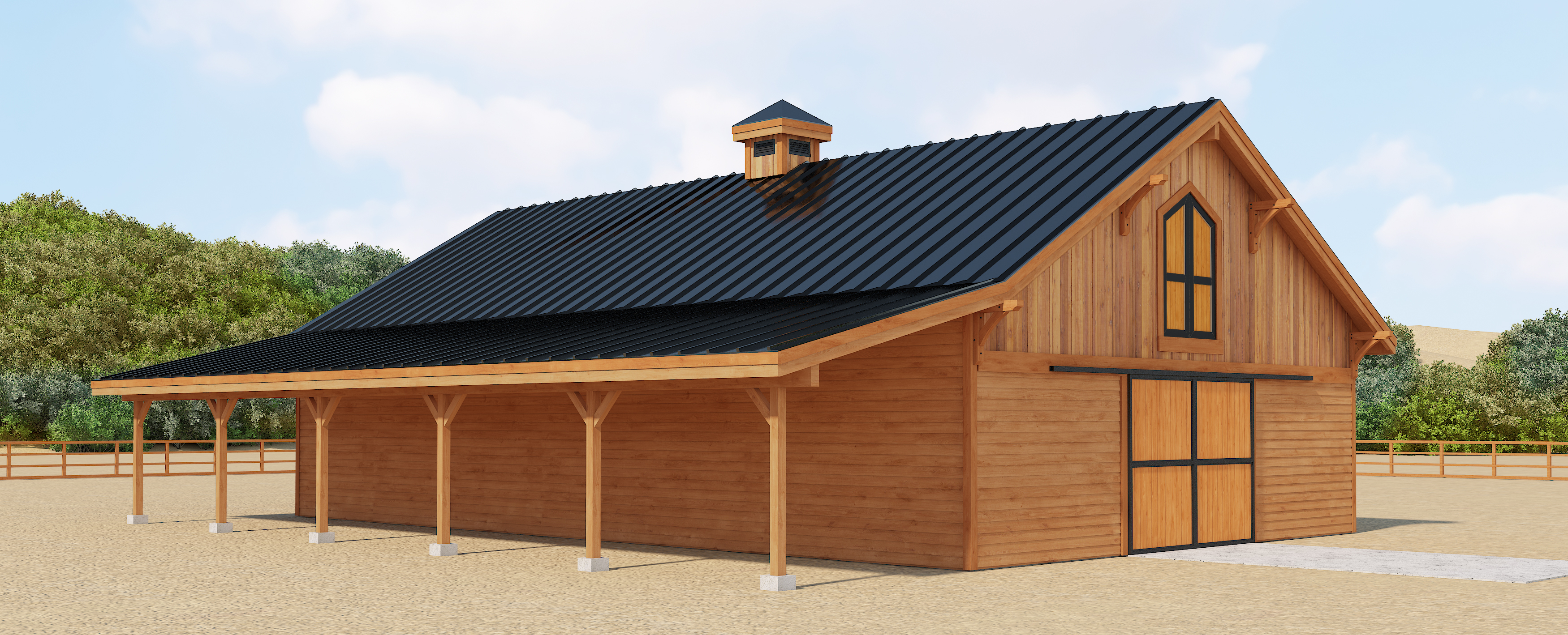 timber clad architectural exterior rendered in cinematic bright natural daylight lighting beautiful clouds in the sky lush green grass on the ground natural light cedar wood siding with black trim wood barn doors with black trim black metal standing seam roof heavy forest area background lush green and dynamic vegetation landscape natural wood textures high fidelity photorealistic visualization crisp shadow falloff refined fa ade geometry richly detailed grain patterns less vibrancy and more detail on the wood soft atmospheric depth calm minimal landscaping premium architectural photography mood ultra clean composition and materials reduce vibrancy