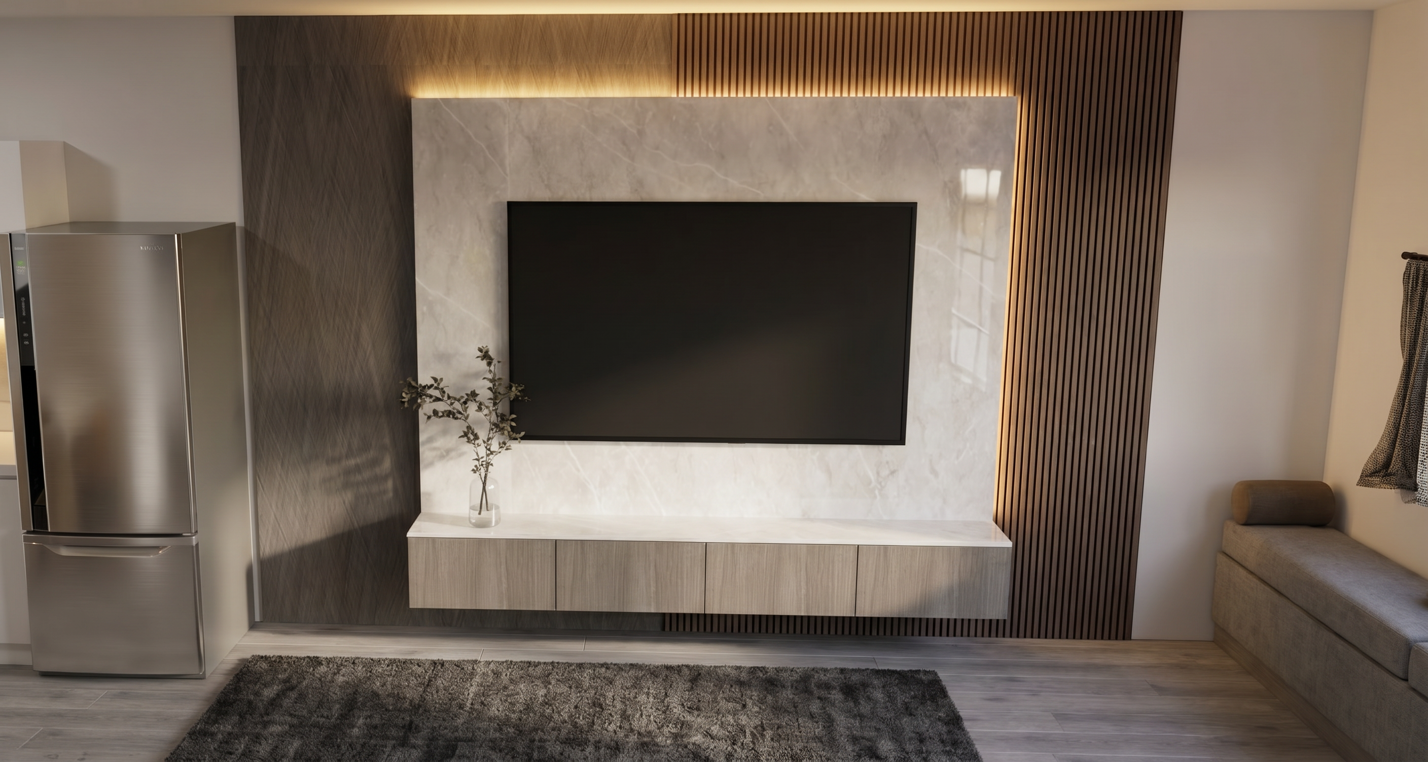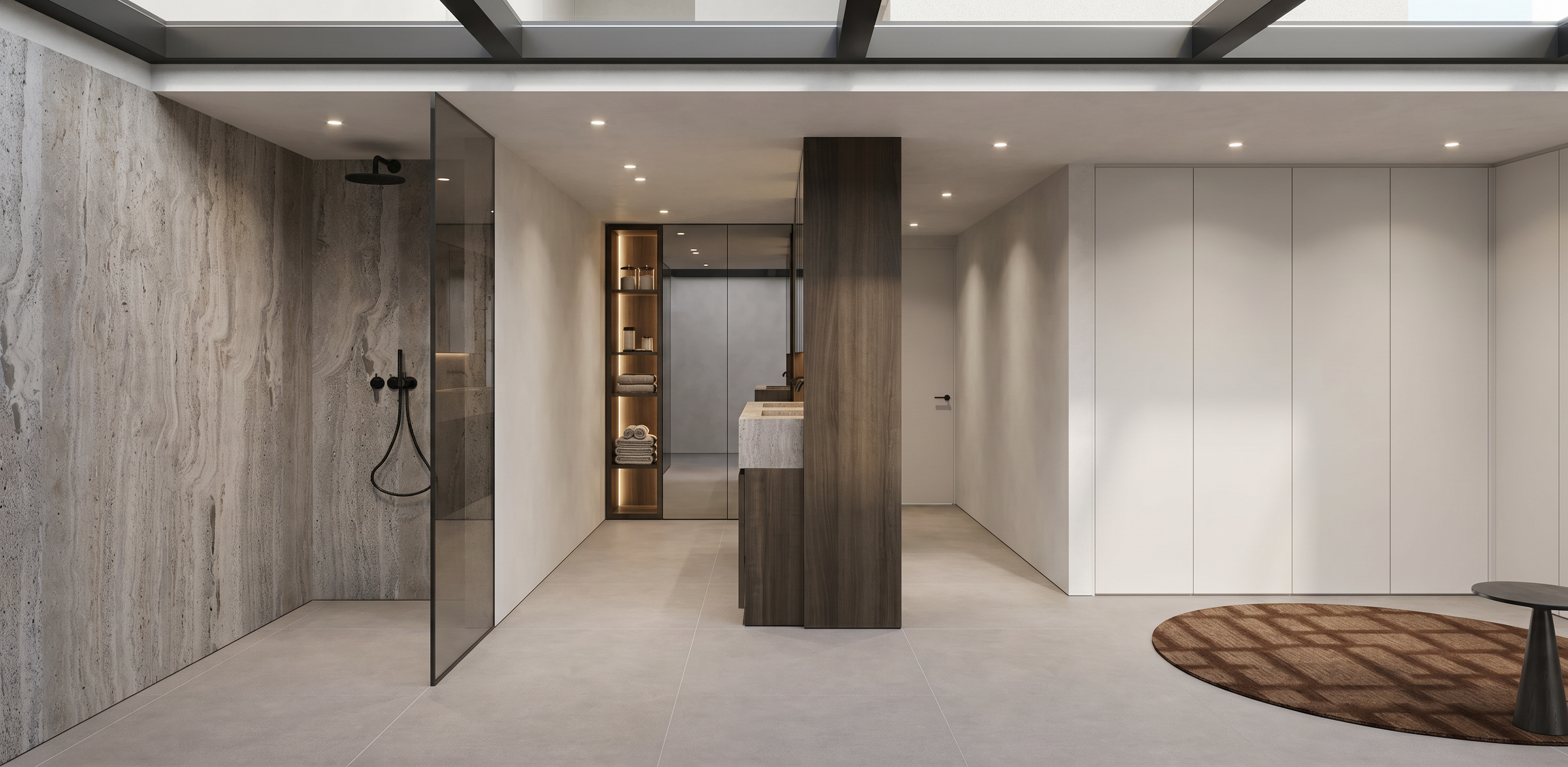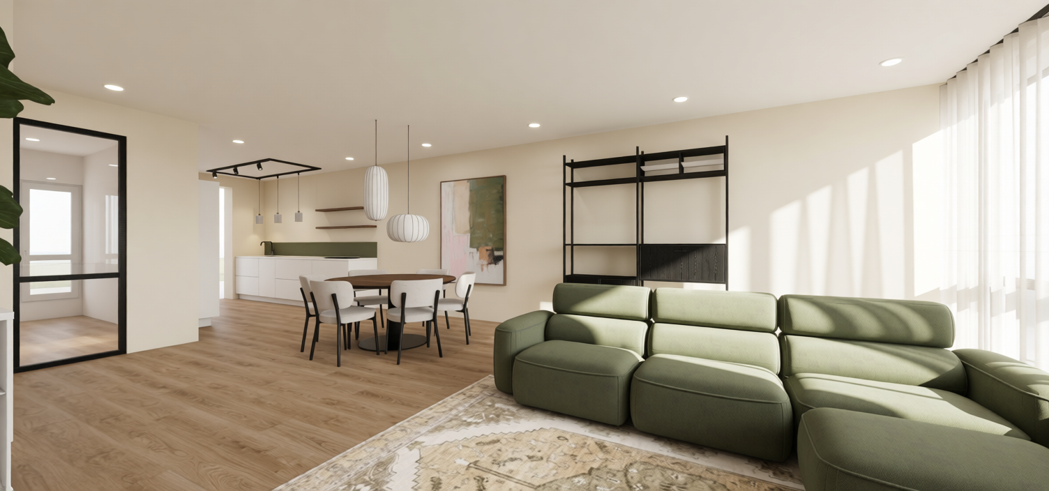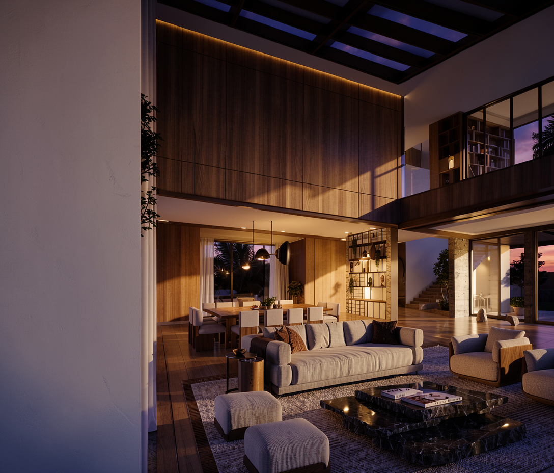 give me this cgi in a evening light add lighting on ceiling perimeter leave texture and furniture sas they are