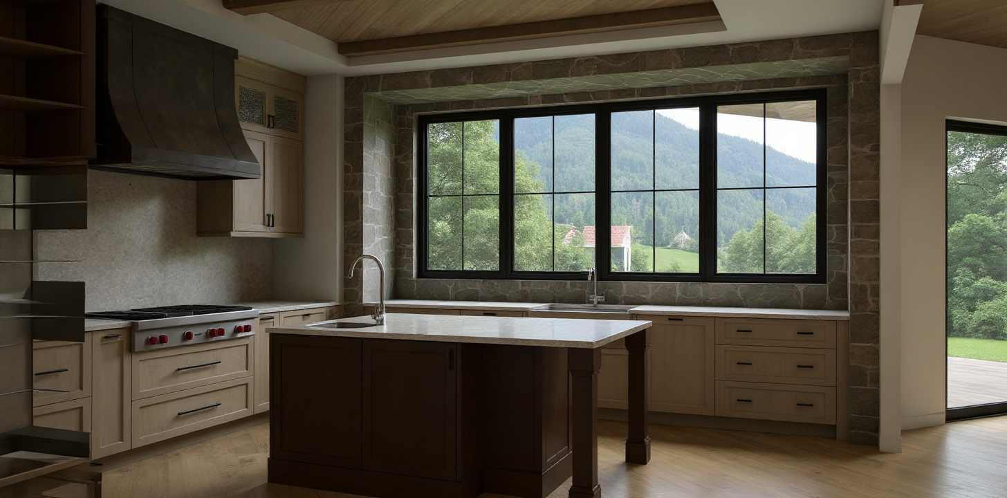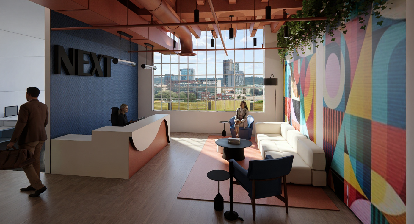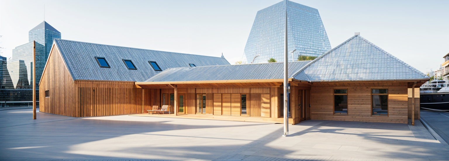 perspective shot render a modern architectural building with a contemporary design the structure features a sleek glass facade with large windows no curtains using a light gray tint for the glass panels the building has brown brick sections that provide a classic yet elegant contrast a stone wall accents the brick in a complimentary light gray color with a subtle texture complement the design the roof is metallic in a galvalume color and adds a polished modern touch the surrounding area includes an asphalt parking lot in a dark gray shade with parked cars and people in the distance and the landscape features an urban environment the atmosphere is calm and professional with soft ambient lighting to enhance the details and colors