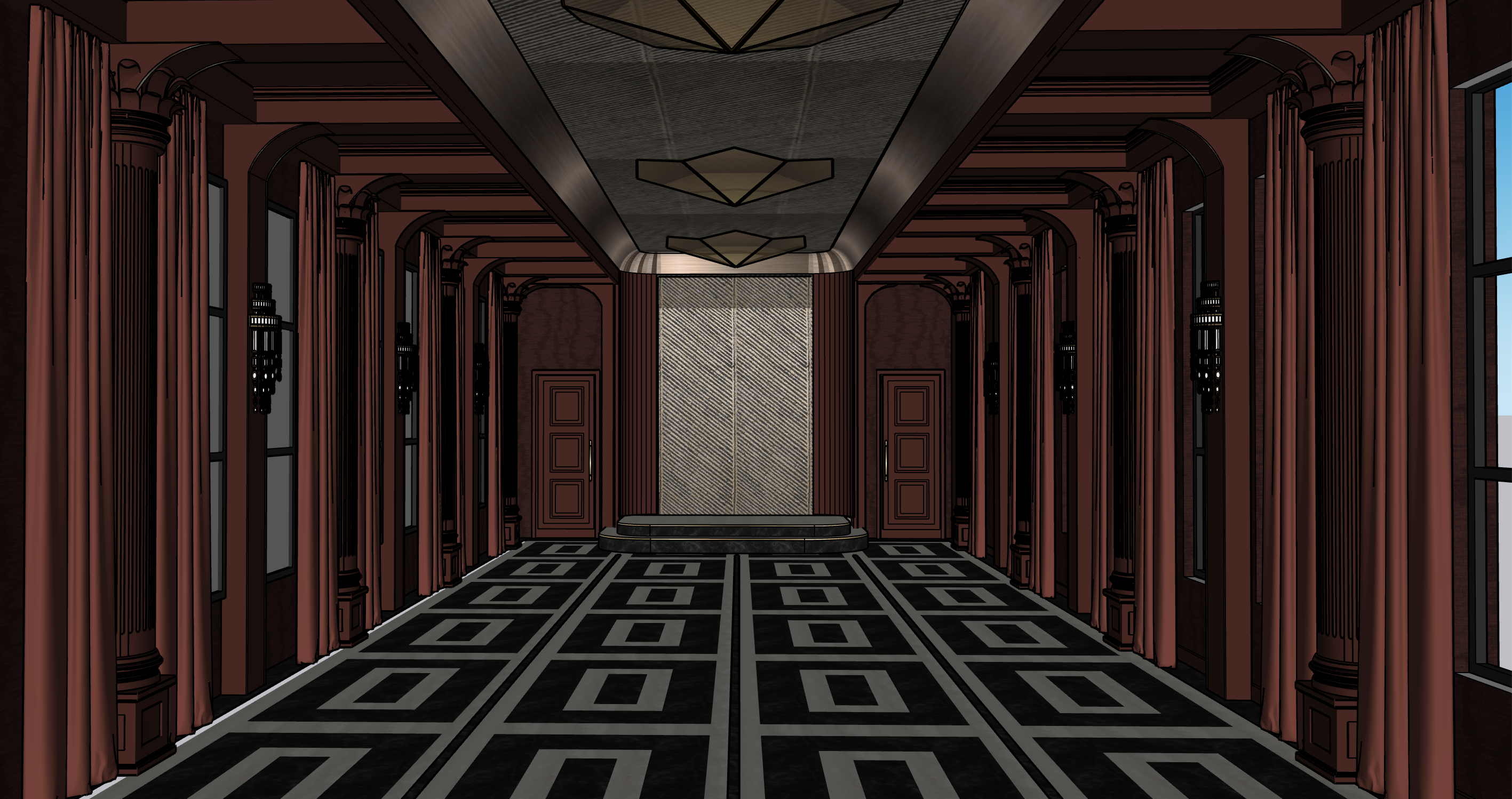 grand ballroom soft light around pewter ceiling cove up lighting from 3 chandeliers in center soft lighting on sconces back wall is a metal textured panel slightly glossy marble flooring keep items looking as is lighten walls so the burgundy stand out more chandeliers in center are not translucent solid with an up glow keep textures the same