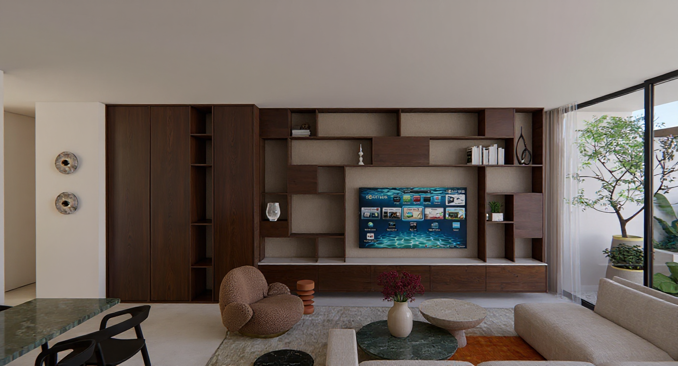 place a small black canopy with wood soffit and pot lights no balcony above it