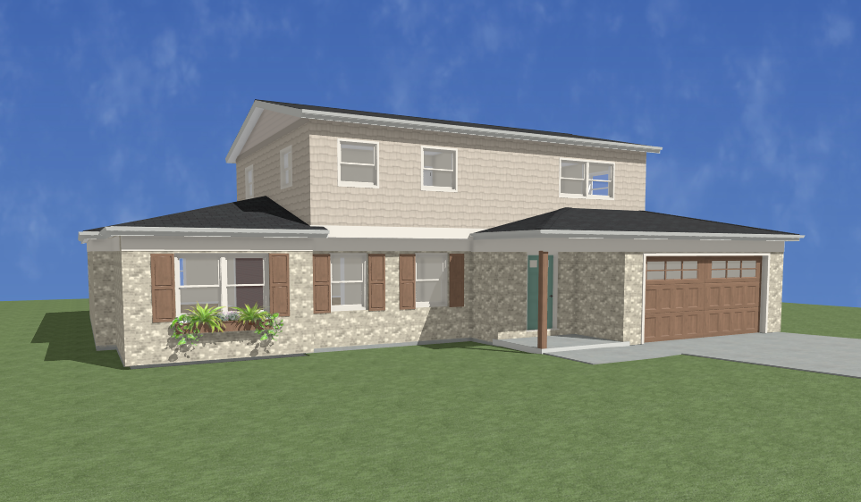 place in a suburban neighborhood with small tree line behind and slight upward approach to the garage