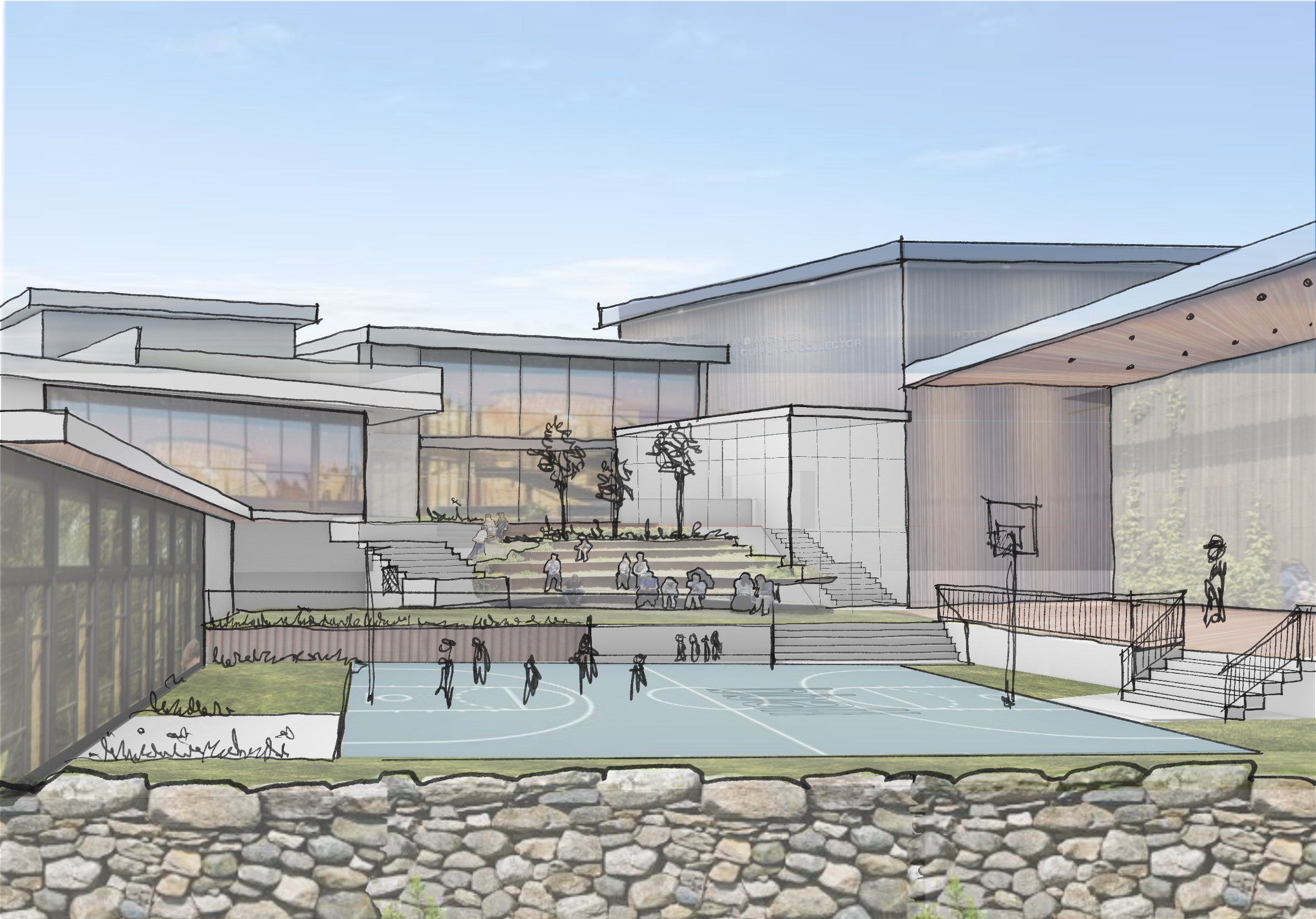 create a highly photorealistic architectural rendering based on the provided sketch collage preserve the original composition massing and cascading landscape concept but translate all elements into real world materials lighting and construction detail the project features cascading landscape terraces that step through the site integrating circulation play and seating include an exterior basketball court as a central active element a small storefront community facing edge and warm wood soffits that unify the architecture and provide a welcoming human scale preserve and reinterpret the materials from the sketch translate them into realistic finishes wood concrete glass painted surfaces while keeping their original character and intent the atmosphere should feel lively vibrant and youth centered populate the scene with children elementary age actively using the space playing basketball running through terraces gathering near the storefront sitting and interacting include subtle motion and candid moments to convey energy and community use warm natural lighting late afternoon or golden hour to enhance material warmth and depth add soft shadows greenery integrated into the terraces and pops of color that feel playful but cohesive camera perspective should be slightly elevated and angled to capture the cascading landscape and multiple program elements at once emphasizing flow connection and activity sun angle needs to pour into the courtyard to illuminate the cascading landscape and make the space feel warm overall tone energetic welcoming safe and community focused clearly designed for a boys girls club environment include lush but controlled landscaping integrated into the terraces grasses small trees and planted edges that feel maintained and buildable