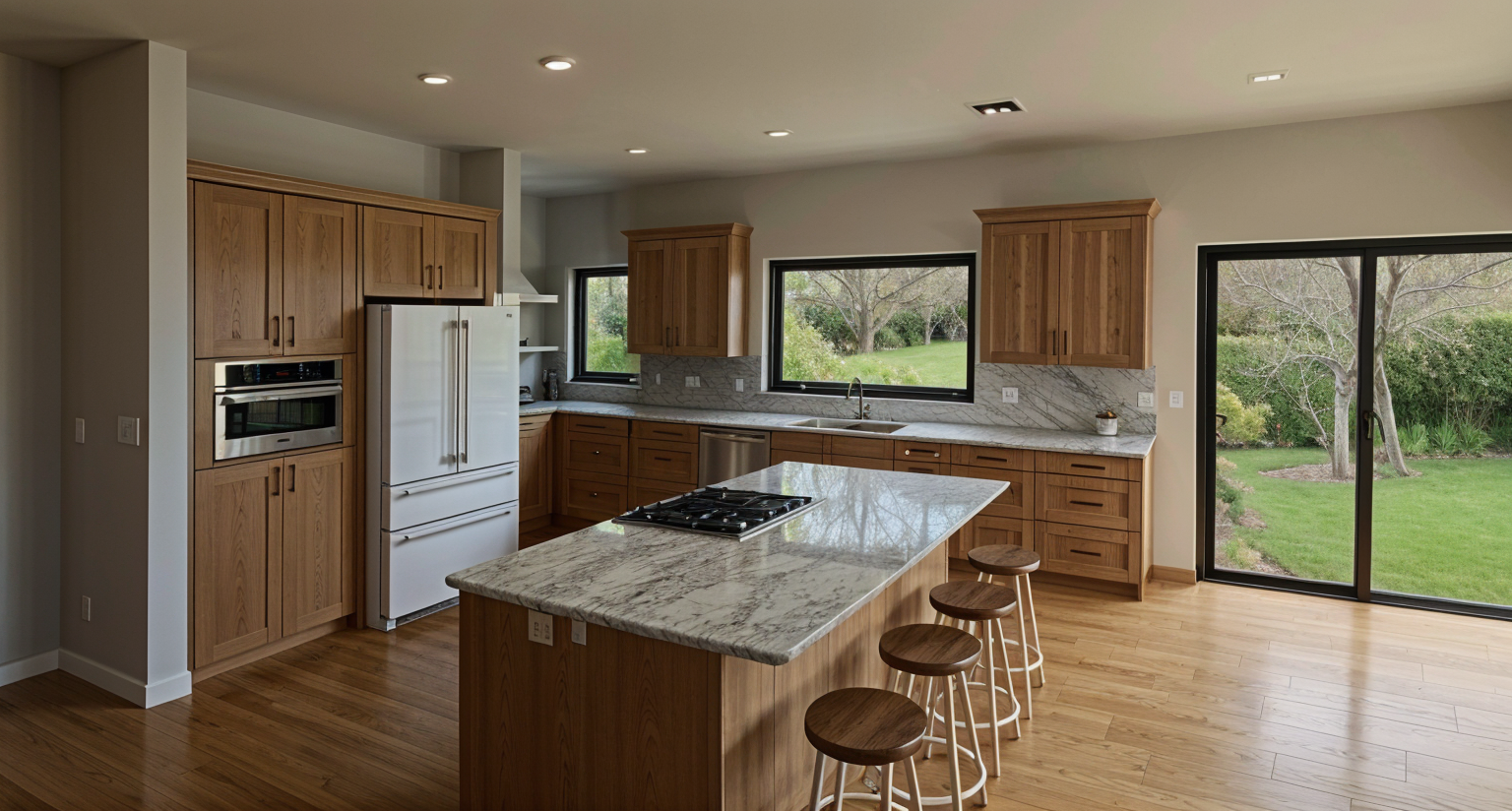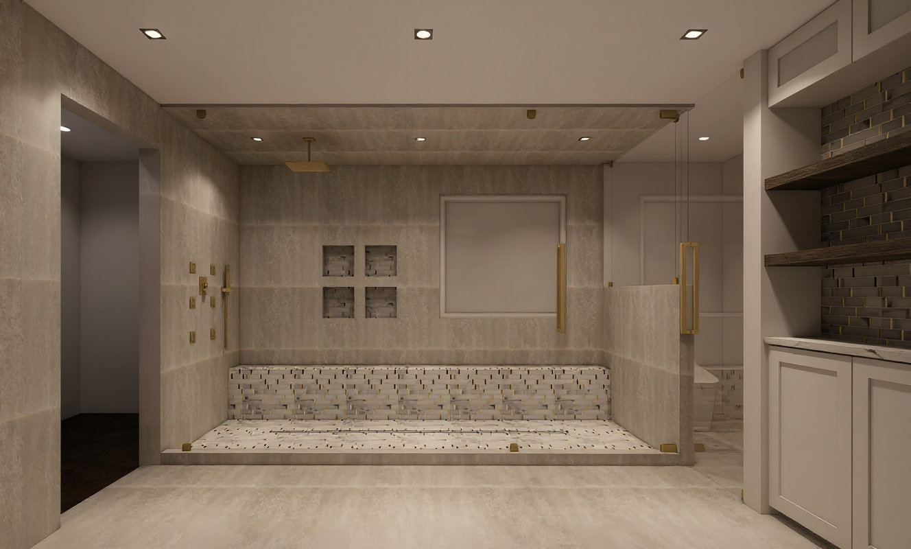 modern study and lounge interior render with a calm sophisticated atmosphere large windows along the left wall black slim profile frames and diffused natural daylight with a view of the perimeter wall and a piece of a light blue realistic sky above the perimeter wall long built in desk with a beige travertine surface and three upholstered swivel chairs in soft cream fabric at the back a minimalist shelving horizontal divisions in beige travertine vertical divisions in light wood unit in light wood with decor pieces and books adjacent to a wall mounted tv with also a light wood back piece a contemporary modular sofa in neutral gray stands on the right paired with two relaxed beanbag over a round gray rug silver marble flooring warm wood panel accent wall and a recessed white ceiling with indirect lighting and small downlights finally a right wall in light beige paint and a light wood door clean lines soft neutral palette photorealistic textures and a refined serene architectural visualization style