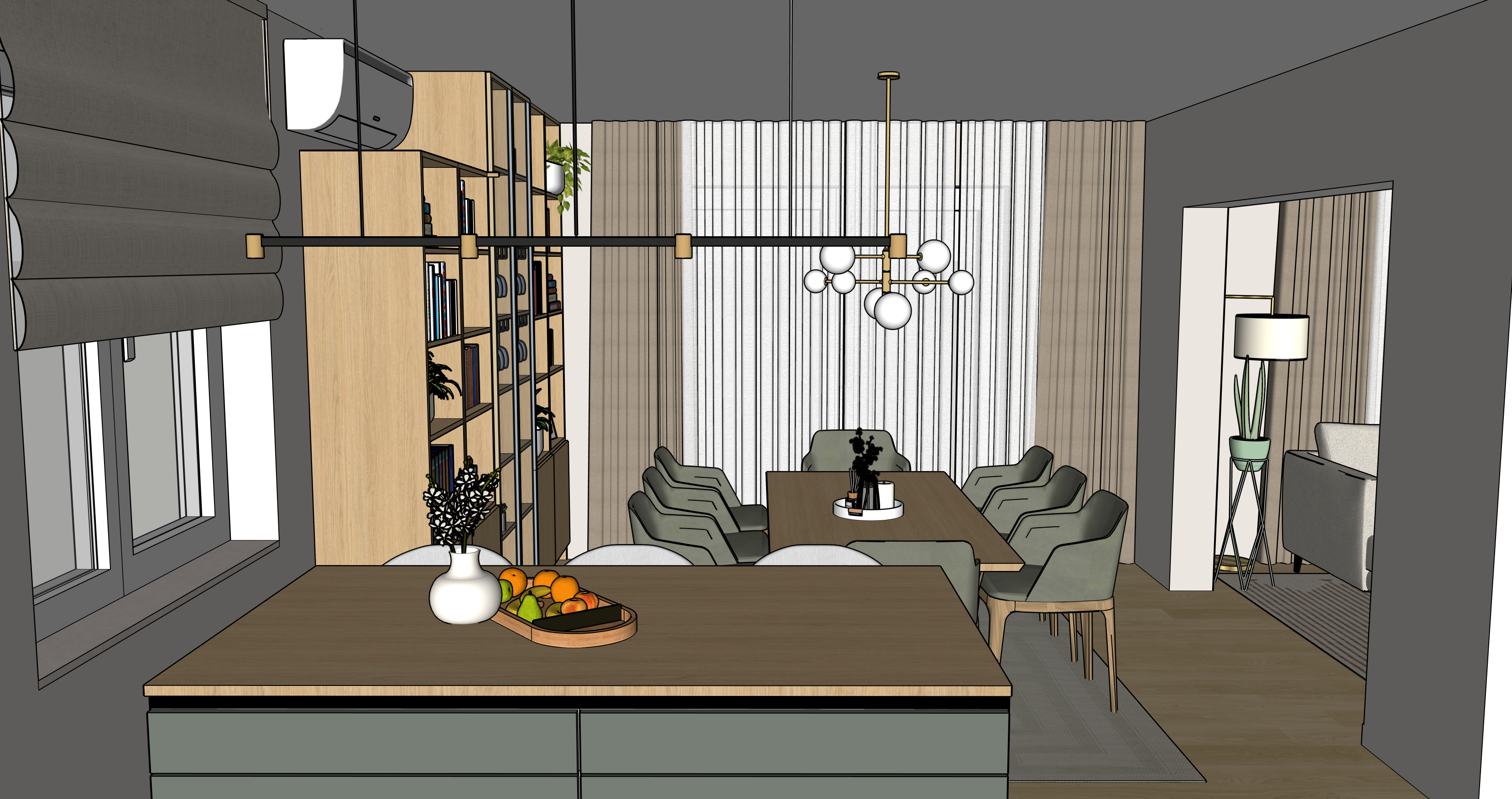 everything is clean and new keep all the original materials the floor is neutral oak parquet warm daylight is coming from the window add a bit more depth the chairs are neutral green fabric the kitchen island worktop is light oak