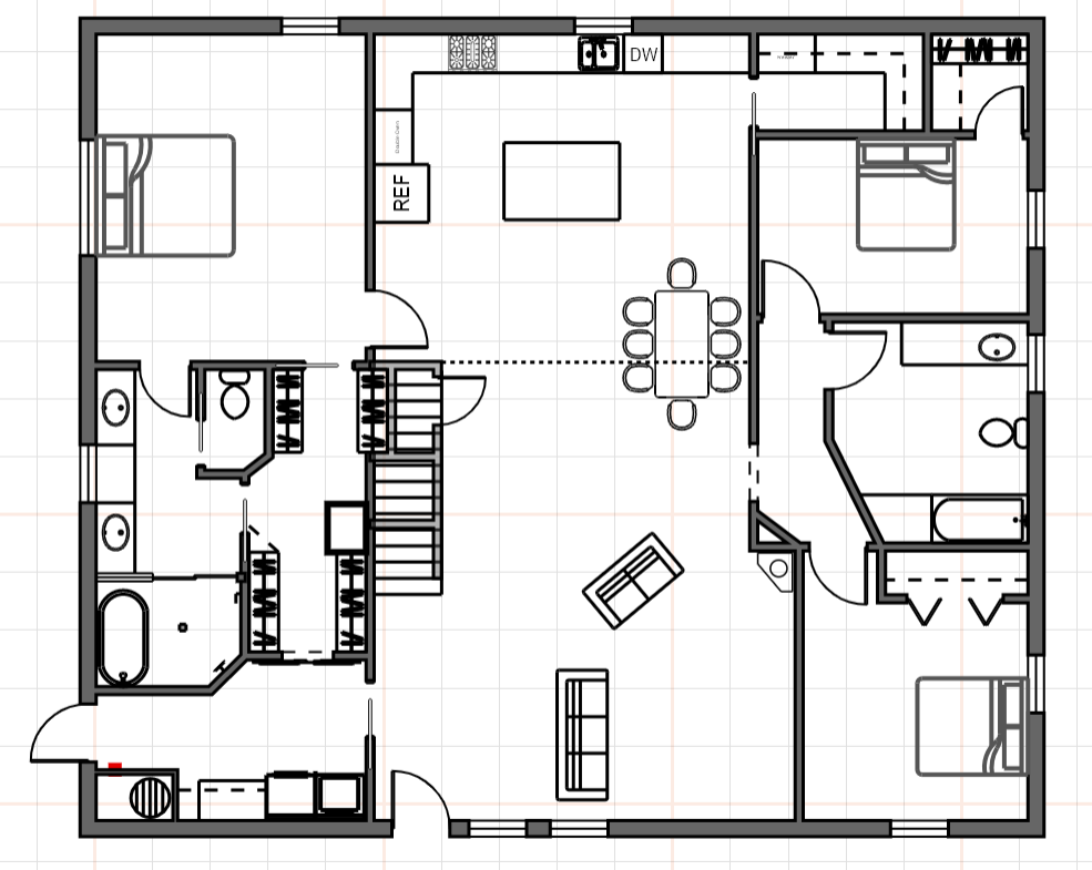 convert this floor plan into a realistic isometric 3d view of a full house show the space from an elevated angle with furniture walls and details visible monitor style barndominium open ceilings throuout living room and dining room with clearstory windows use the same furniture as shows on the plan do not change the orientation of the floorplan