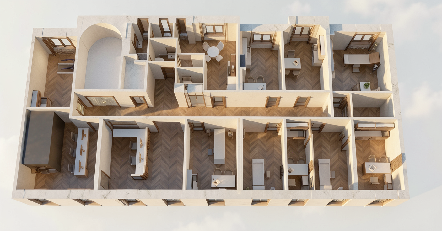 realistic interior render daylight soft shadows burgundy deep glossy tiles in the background chrome kitchen black leather wassily knoll armchair in the front beige sofa terrazzo flooring soft shadows