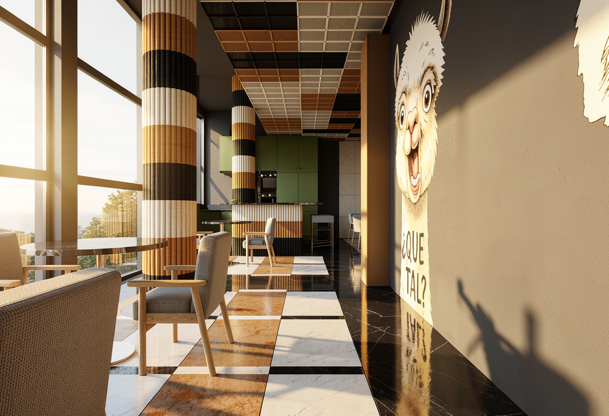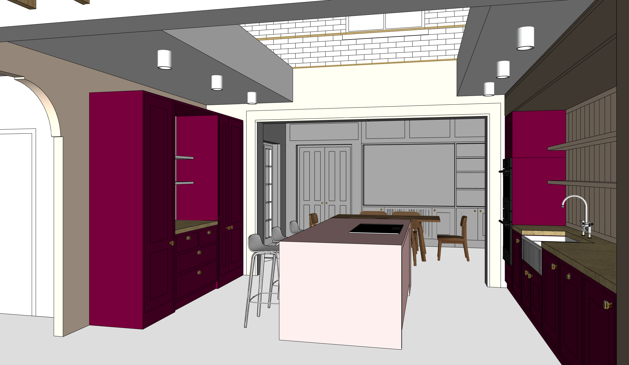 do not change any object s geometry or proportions or add any details the kitchen island is to be pink marble and the countertop around the sink is patinated copper with a small upstand and cream painted timber panelling and shelves above the kitchen cabinets are deep plum brown and the floors are refurbished light oak boards the ovens are black and natural daylight fills the space from the rooflight over the kitchen island the dining table is a mid toned walnut with matching chairs and all panelling and shelves to the dining area are crisp light grey beneath the kitchen island is pink marble with a black hob