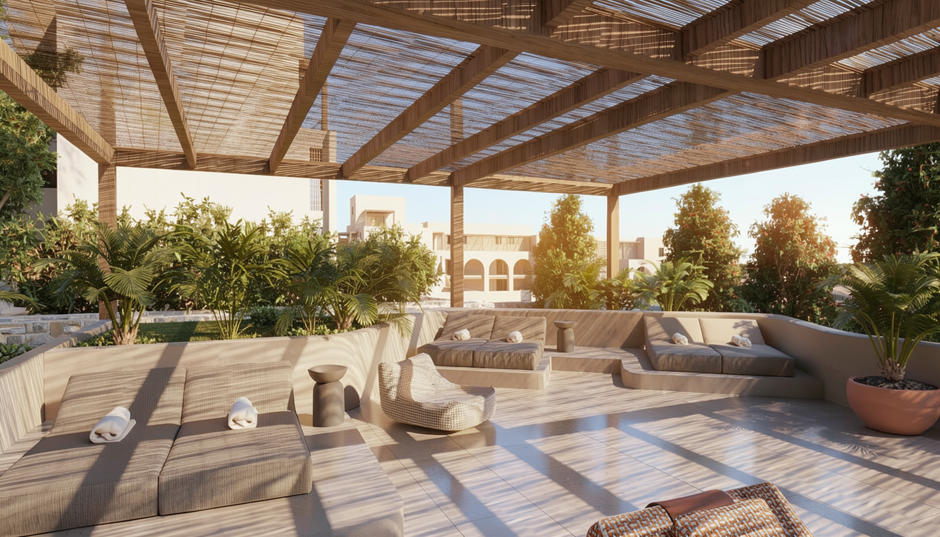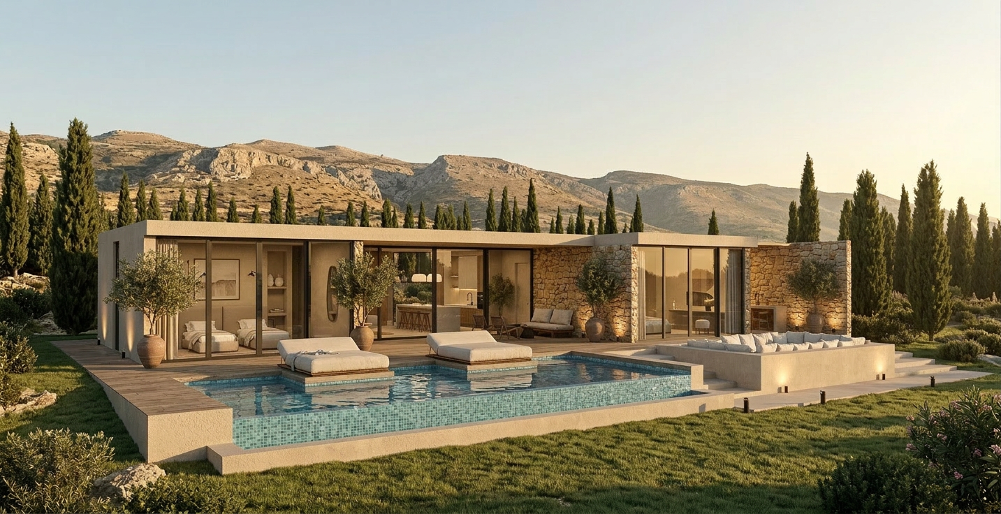 reduce the number of cypress trees on both sides of the photo and add some olive trees make the light cooler om the image like strong daylight do not change anything else in the photo