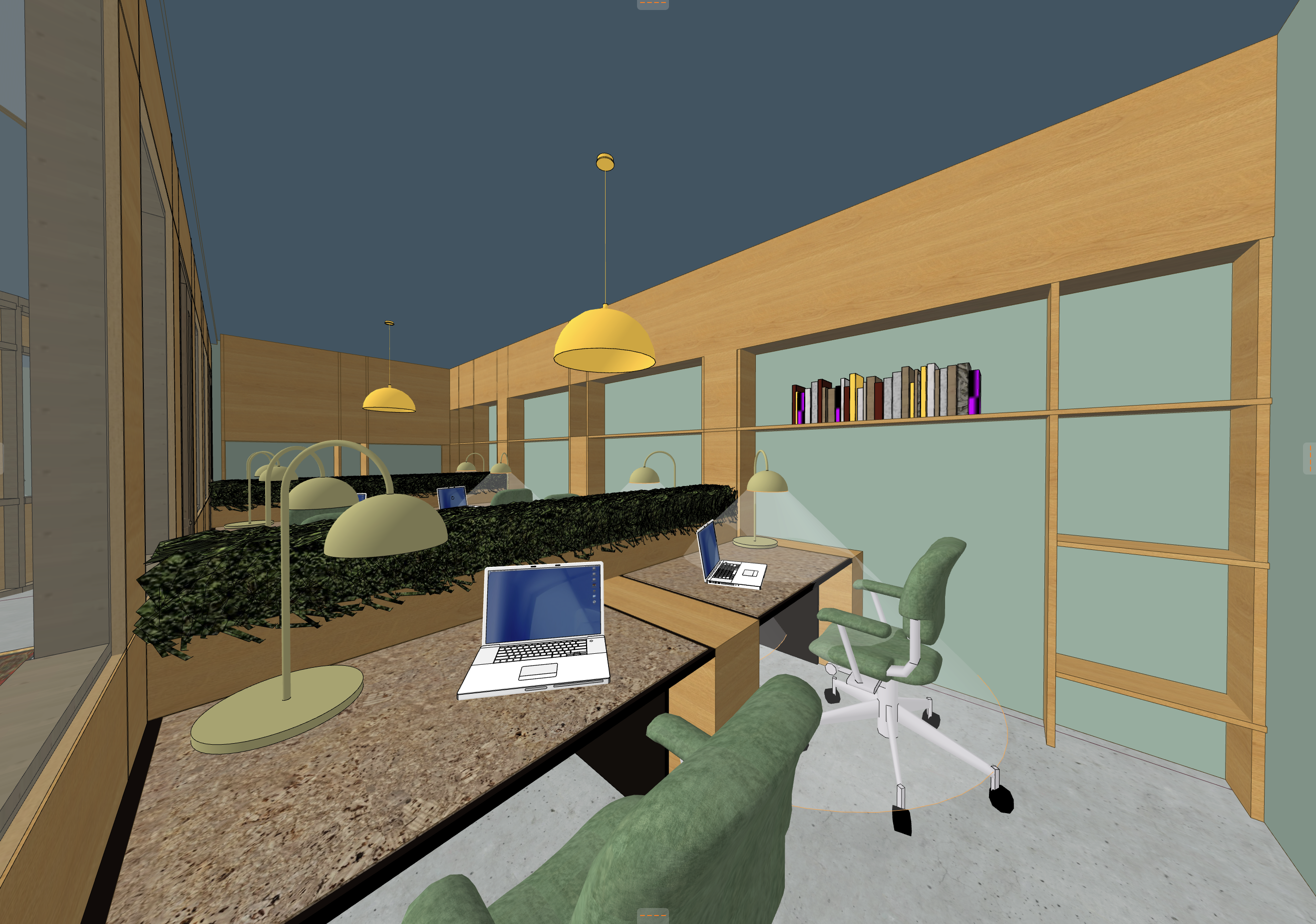 a modern office space with a minimalist design featuring wooden walls in a light oak color and a blue gray ceiling the atmosphere is calm and inviting there are sleek desks with a speckled granite surface accompanied by plush sage green ergonomic chairs soft yellow pendant lights hang from the ceiling casting a warm glow bookshelves are integrated into the wall stocked with colorful books lush dark green plants add a touch of nature while beige desk lamps provide focused lighting the overall ambiance is serene and professional ideal for focused work