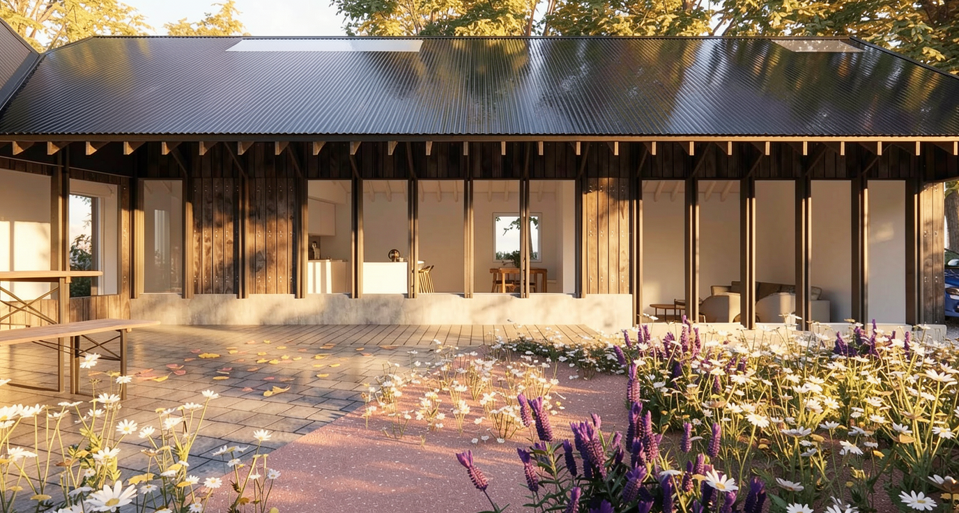 create rendered aerial plan view of cottage apartment in warm neutral palate bathroom has white marble floors kitchenette has white cabinets with white marble countertops and stainless steel appliances white 42 table with upholstered chairs and warm wood buffet golf simulator has green turf floors and projection screen at east wall white sofa and chairs with colorful accent pillows white king murphy bed with bookcases on either side warm wood floors throughout space