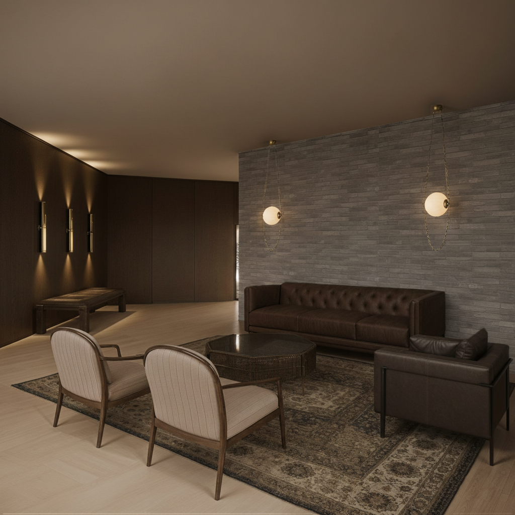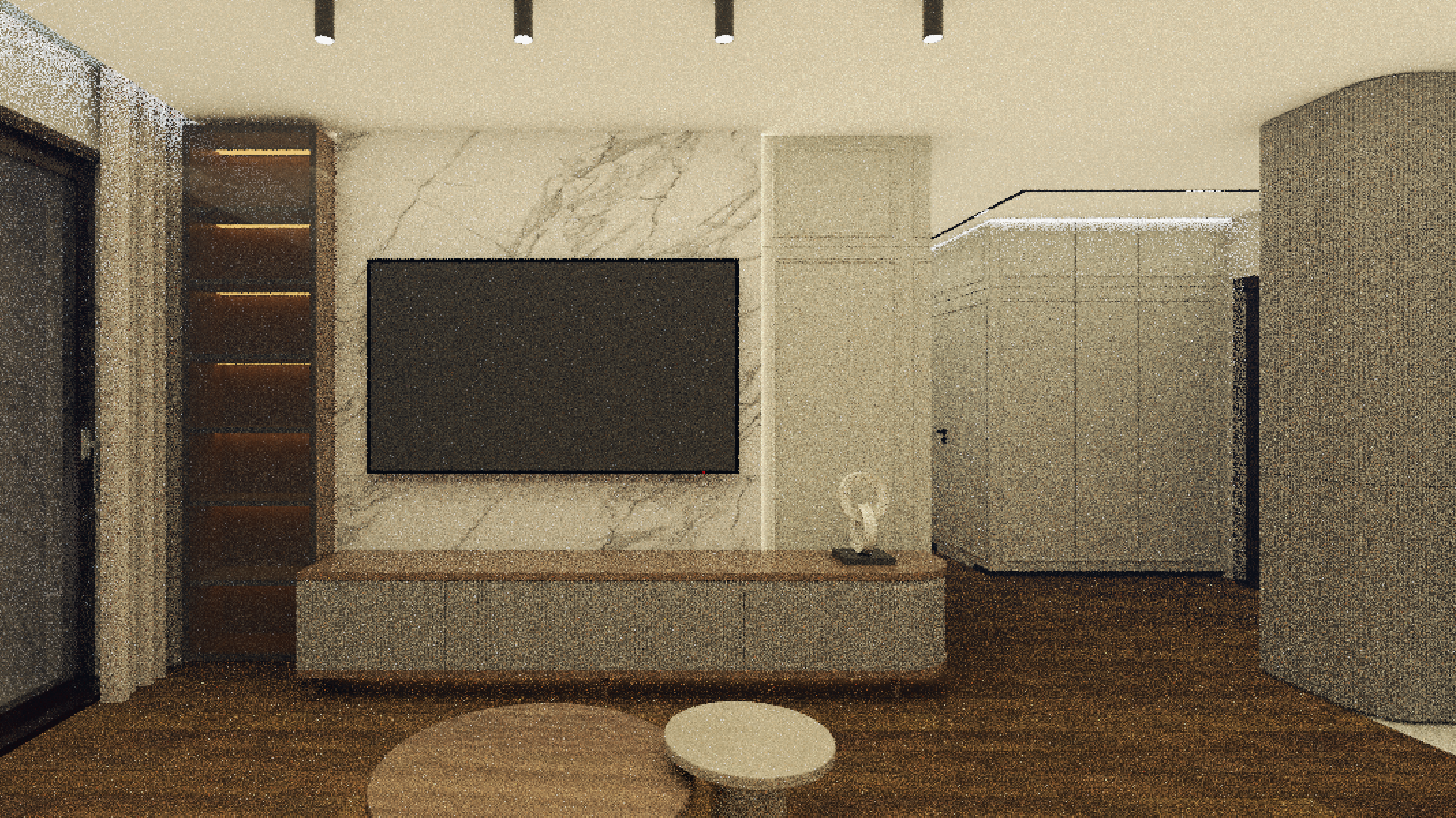 create a photorealistic interior rendering of modern living room preserving exactly the existing camera position framing perspective geometry scale proportions materials textures colors and functions of all architectural and furniture elements do not move resize redesign remove or replace any walls niches panels ceiling surfaces or floor elements only improve rendering quality texture realism and lighting atmosphere render a sophisticated modern living room with warm lighting the walls feature elegant gray paneling complemented by a smooth white marble accent wall with subtle gray veining a sleek black flat screen tv is mounted centrally above a minimalist console with glass and wooden elements like in a picture now a pair of nesting tables in contrasting light beige and brown sits on the wooden floor enhancing the cozy atmosphere floor to ceiling curtains in a soft beige frame large glass doors creating an inviting airy feel add ambient lighting with black ceiling spotlights casting a gentle warm glow throughout the room lighting enhancements concealed warm led strip lighting 2700k leds must remain invisible 2700k strictly atmosphere warm elegant mood with soft indirect lighting gentle highlights on wall panels and highly realistic materials add reflections to all glass surfaces terace door shelf and console doors put some books inside shelf cabinet outside is urban surrounding with some trees all wall panels nad furniture corpuses should be of the same colour gray do not change wood decor all doors of the shelves and tv console should be dimmed more more grayish do not add new elements except on coffee tables put some nice decoration there like books and small greenery thanks material of the console should be same as tall element covered fith small cylinders