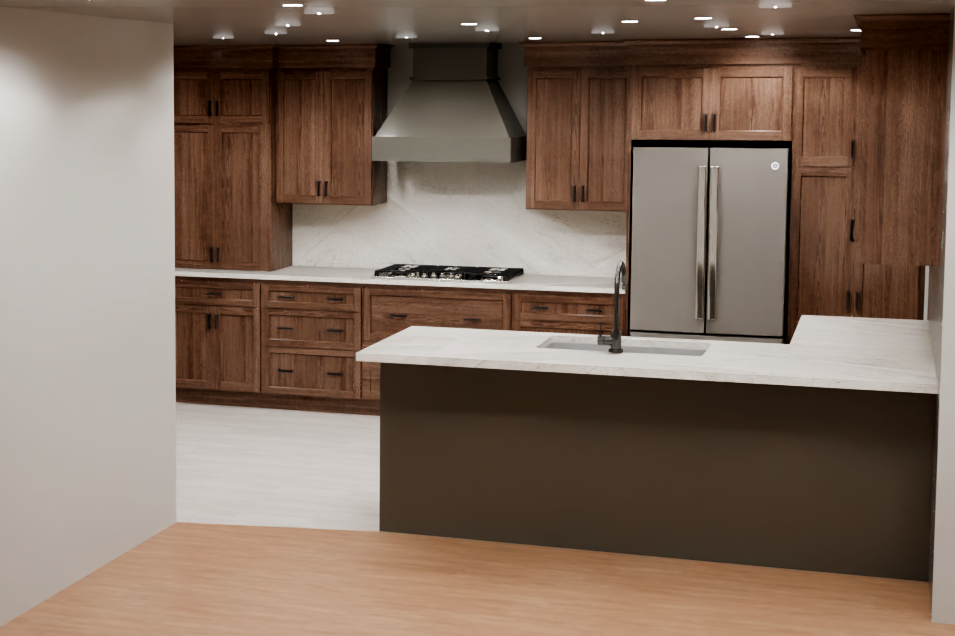 render a modern kitchen featuring dark walnut cabinets with a smooth matte finish highlight the elegant white marble countertops with subtle gray veining adding a touch of luxury integrate a sleek stainless steel refrigerator providing a contemporary contrast the hood is in a deep warm gray use soft ambient lighting from recessed fixtures to create a welcoming atmosphere accent the scene with neutral toned walls and a lightly textured warm stone floor enhancing the inviting ambiance