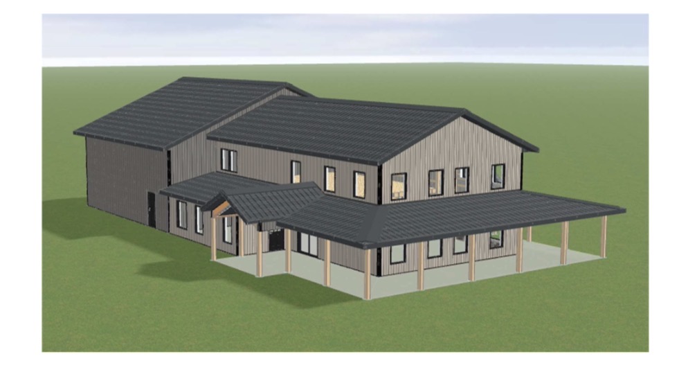 luxury modern barndominium in countryside setting white steel siding with black roof exposed timber beams large covered wrap around porch black steel windows oversized glass front door stone chimney feature landscaped yard gravel drive and modern barn garage doors warm sunlight photorealistic rendering architectural visualization cinematic lighting highly detailed textures inviting and elegant rural home