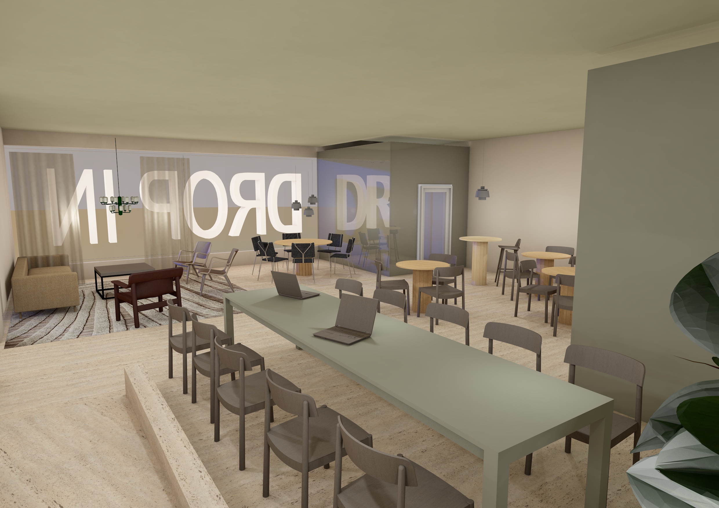 make it more photo realsitic and cozy make it brighter and more like an office lounge