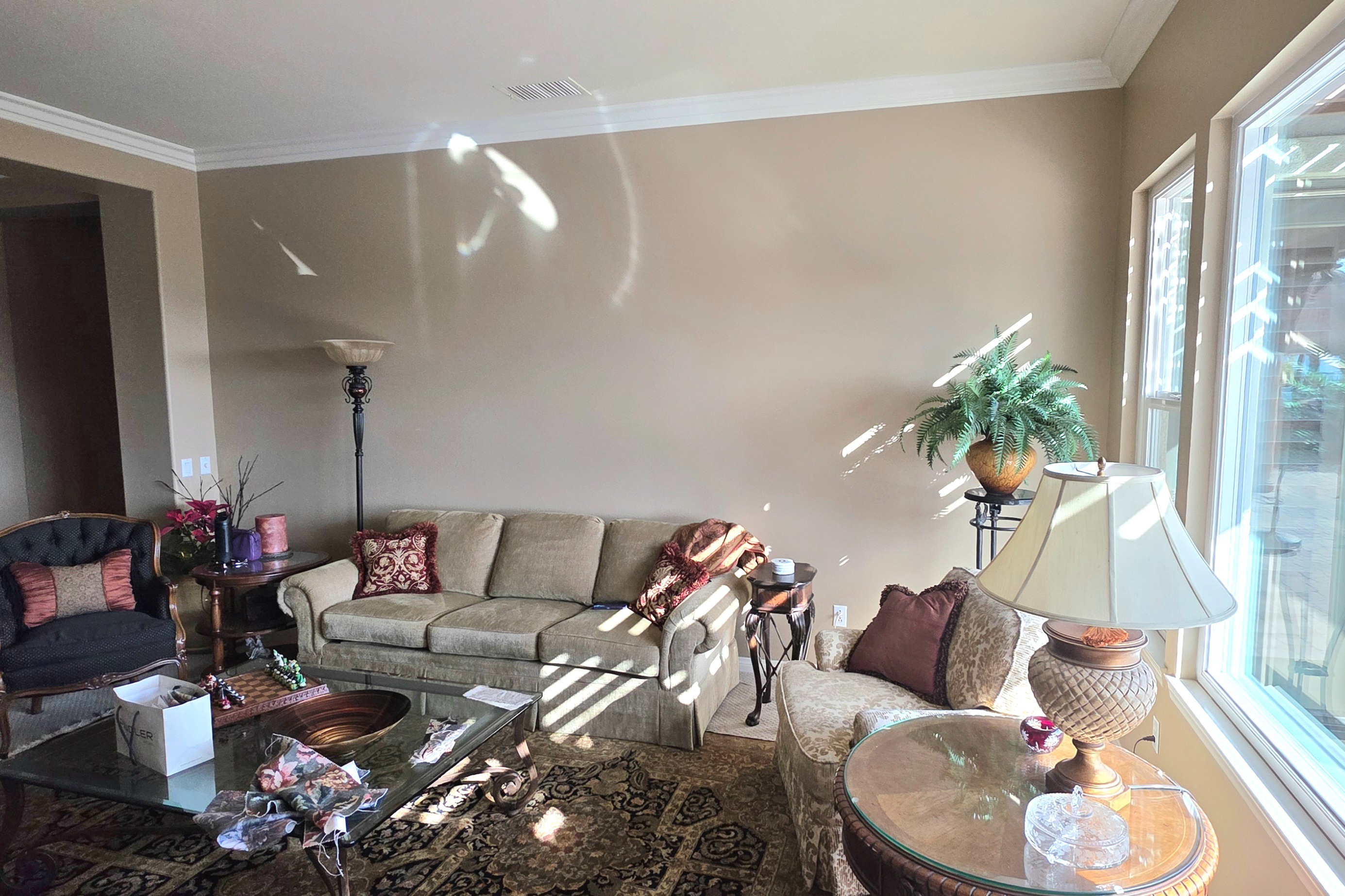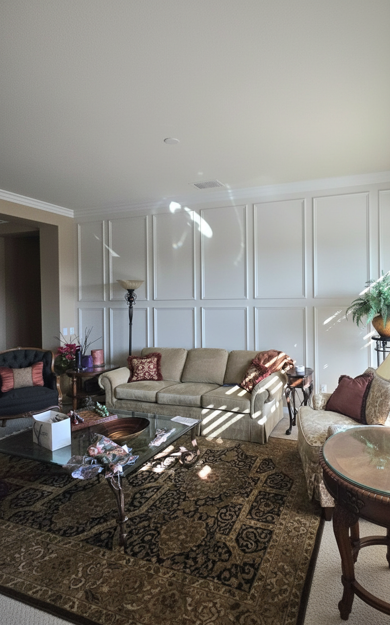 add column panel in corner of opening in same style as reference image maintain same colors furniture and textures