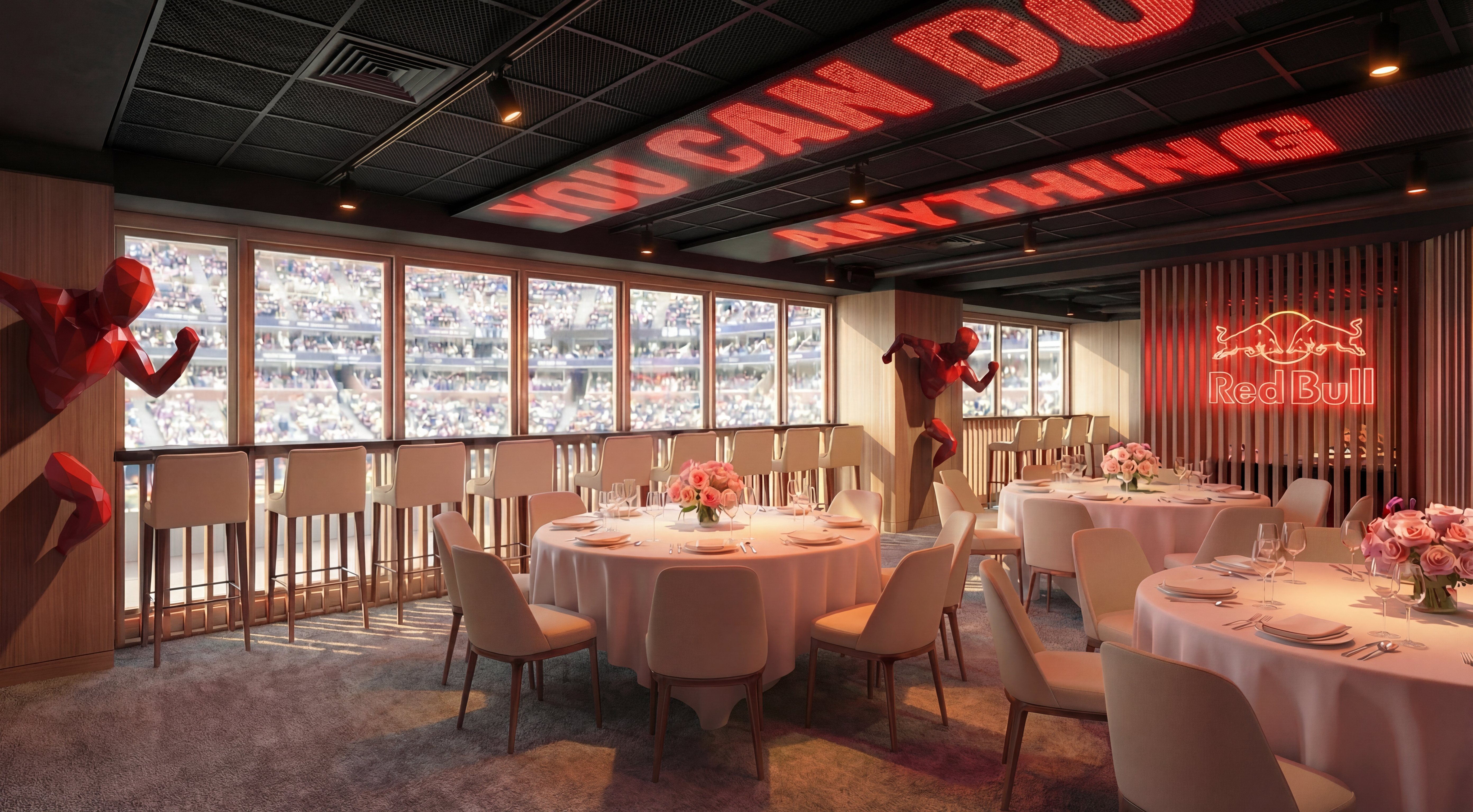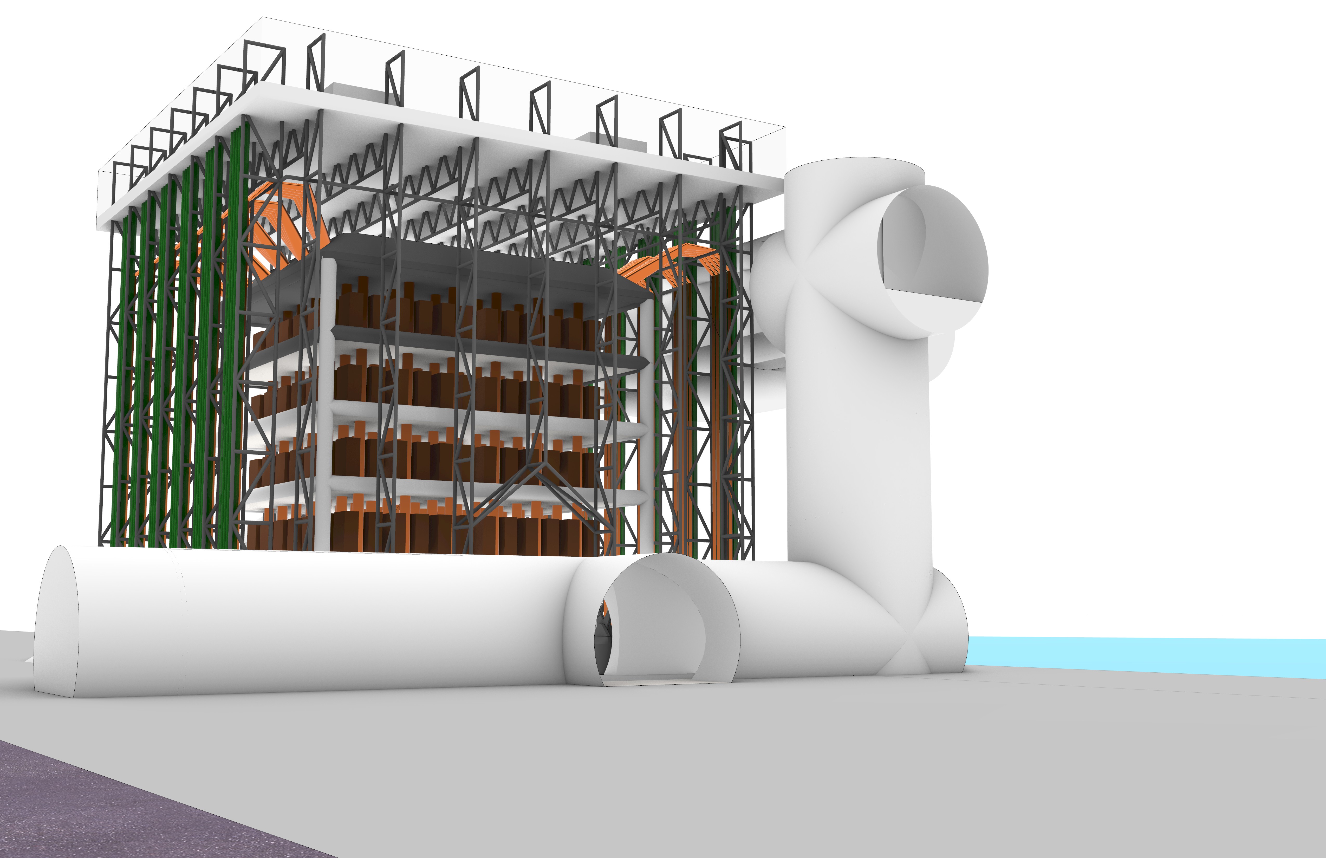 create an photorealistic architectural rendering of this building do not change any geometry place a small parking lot in the gray area along the bottom add lots of landscaping and foliage in the parking lot as well the purple is the asphalt from the street the blue in the background is a river that flows past the building add a set of doors and windows to the circular opening in the middle of the white tube keep the doors and windows within the circular cut out the upper circular cut out needs to remain as glass the brown boxes on the inside of the building need to become computer servers the orange tubing is meant to be a metallic copper piping