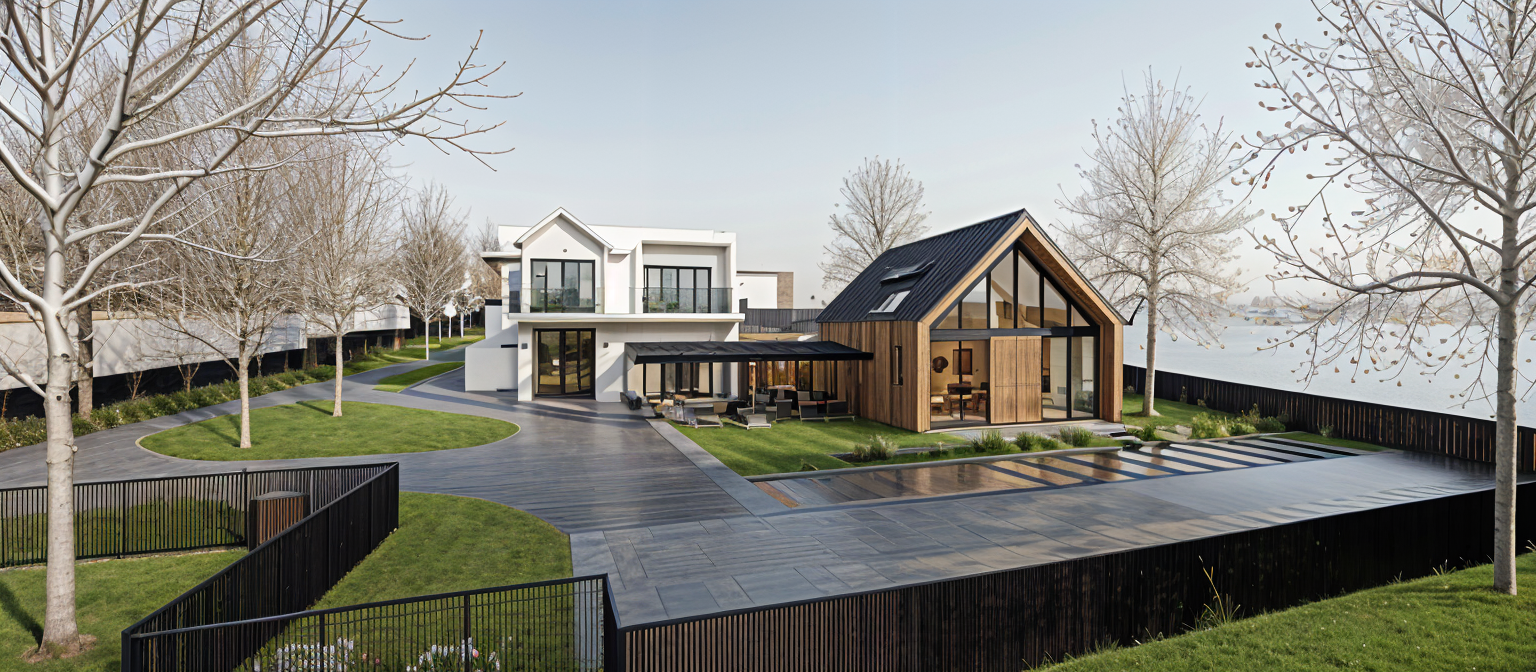 modernist exterior shot a beautifully rendered modern minimalist house set amidst a serene natural environment the house features angular wooden structures with a dark gray and black exterior large glass windows reflect the subtle hues of the surrounding landscape the wooden siding has warm earthy tones like soft browns and is combined with sleek contemporary black trimming the atmosphere is tranquil and the lighting is soft mimicking a gentle morning or late afternoon light the ground is adorned with patches of green moss and vivid yellow wildflowers adding a burst of color and life the surrounding trees are leafless drawn with delicate thin black lines indicating the late autumn season shadows of the trees create an intricate pattern on the house and the ground in varying shades of gray and brown the entire setting feels both modern and natural embracing simplicity and elegance architecture white facade keep windows from concept wood factory inside keep industrial metal door to building and keep windows pozitions change roof steel black grey and side stell same color keep paving the parking