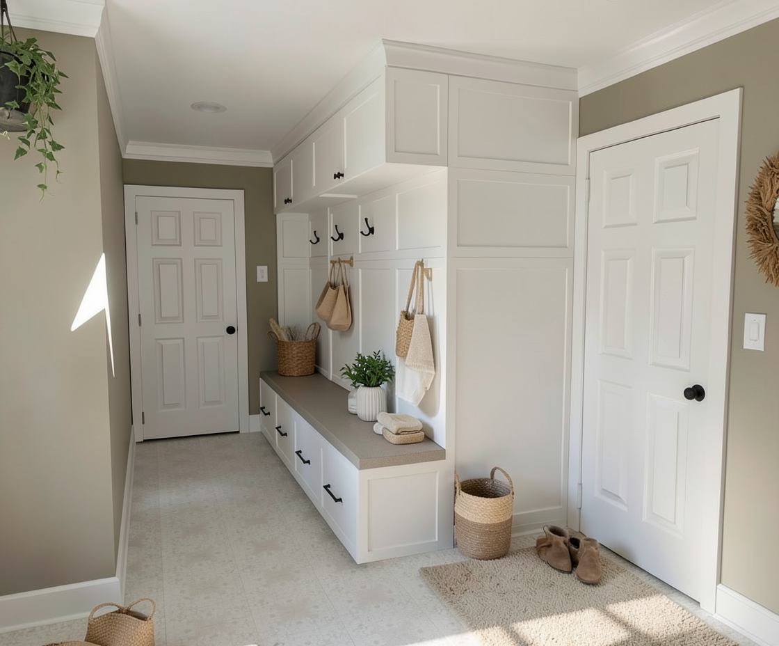 lightly accessorize this mudroom keeping surfaces clear with nothing on them