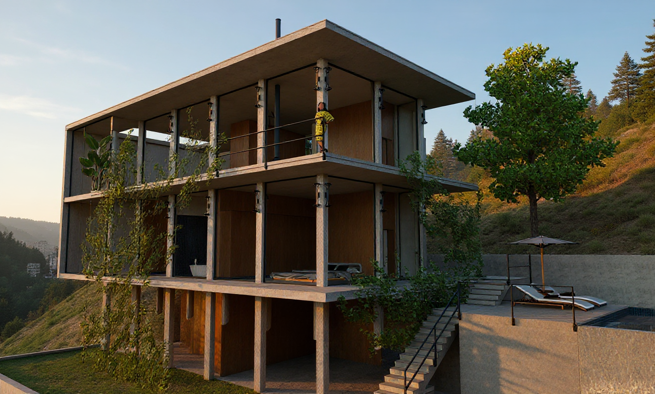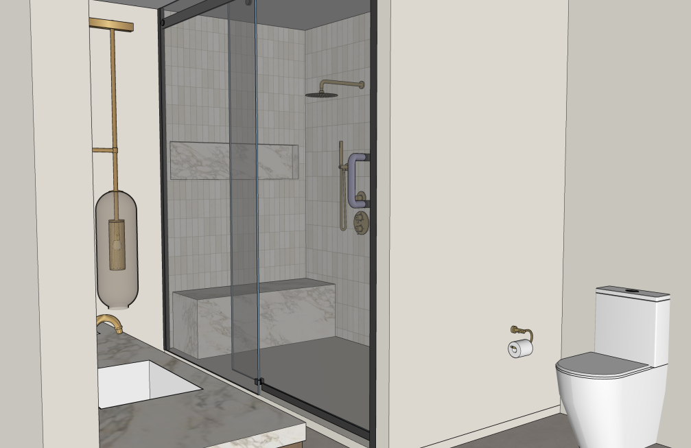 render this bathroom as a photorealistic interior do not change any colors materials finishes proportions or design elements keep the warm medium wood vanity brass faucets and hardware white undermount sinks marble countertop with soft grey veining neutral wall color beige flooring brass framed mirrors and matching sconces exactly as shown maintain the exact layout geometry and camera angle add natural daylight entering from the window based on the angle of the scene creating soft realistic ambient light and gentle shadow falloff do not add harsh beams or window grid shadows only enhance realism by improving material depth reflections lighting behavior subtle shadows and surface texture while keeping all existing colors and materials completely unchanged