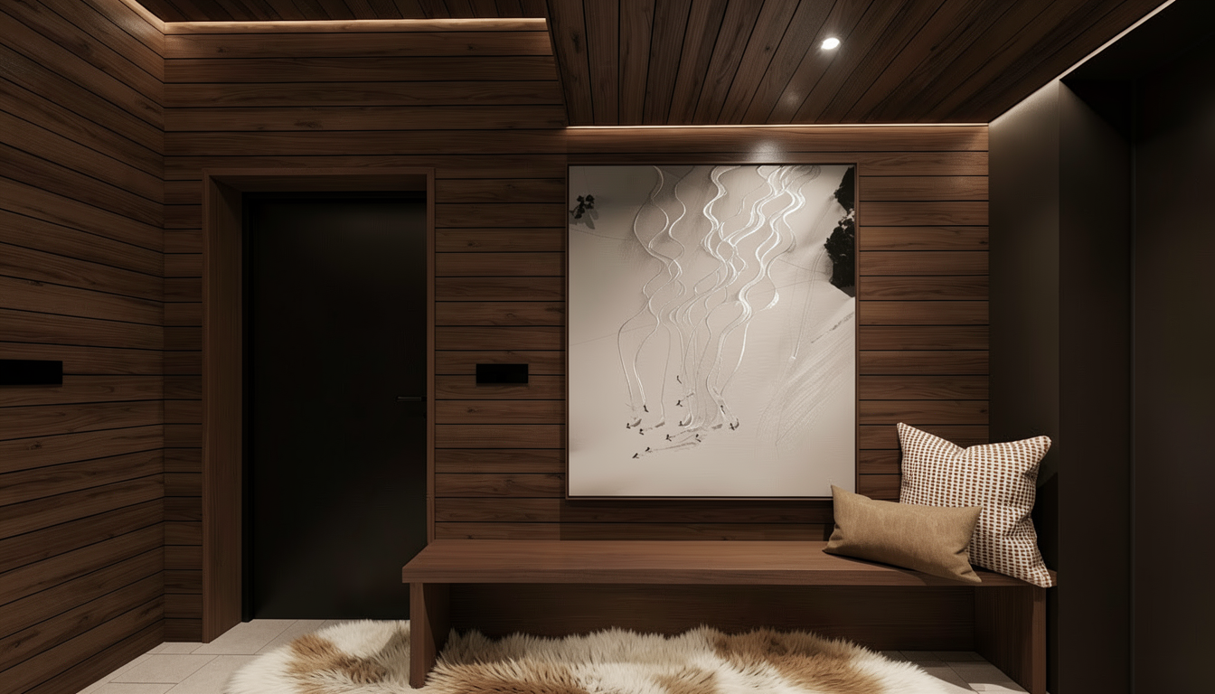 add plaster texture on wall in microcement light beige style add lights on spotlights add light texture on wooden parts it has to be wood like in origin picture preserve every object and dont add any new objects make daylight in render change the plant more realistic sofa with beige fabric in textured canvas vases from glass on furniture make translucent curtains